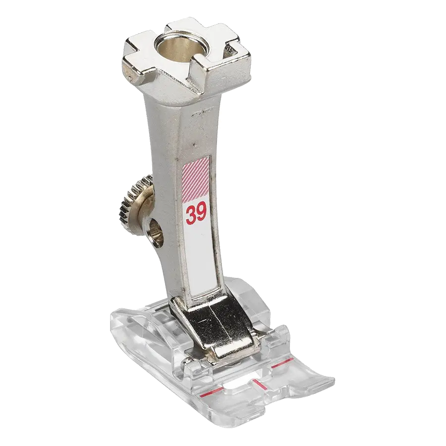 Embroidery foot with clear sole #39 provides a clear view of the stitching area and is an expert in decorative stitch patterns, appliqué, and satin stitching.
