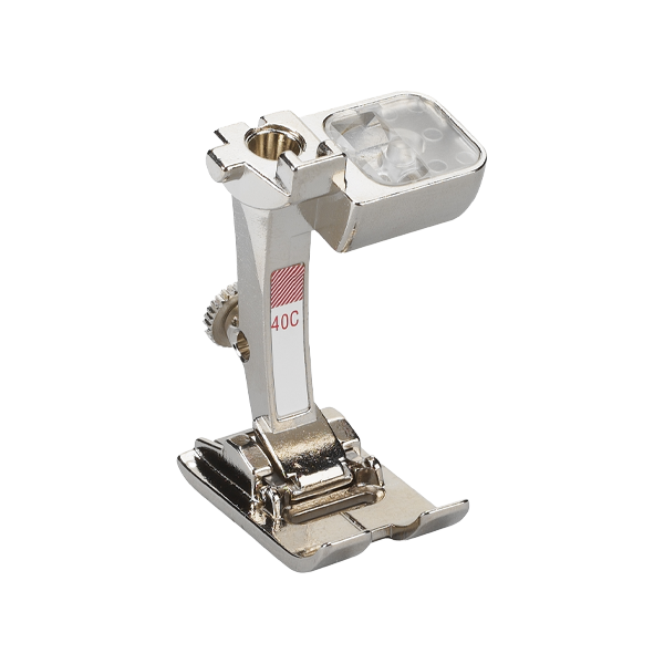 The Sideways-Motion Foot #40C makes light work of sewing large, elaborate designs in any direction. This presser foot has a decisive advantage: the edge of the cutout on its sole is bevelled, allowing the foot to ride easily over the stitches in any direction.