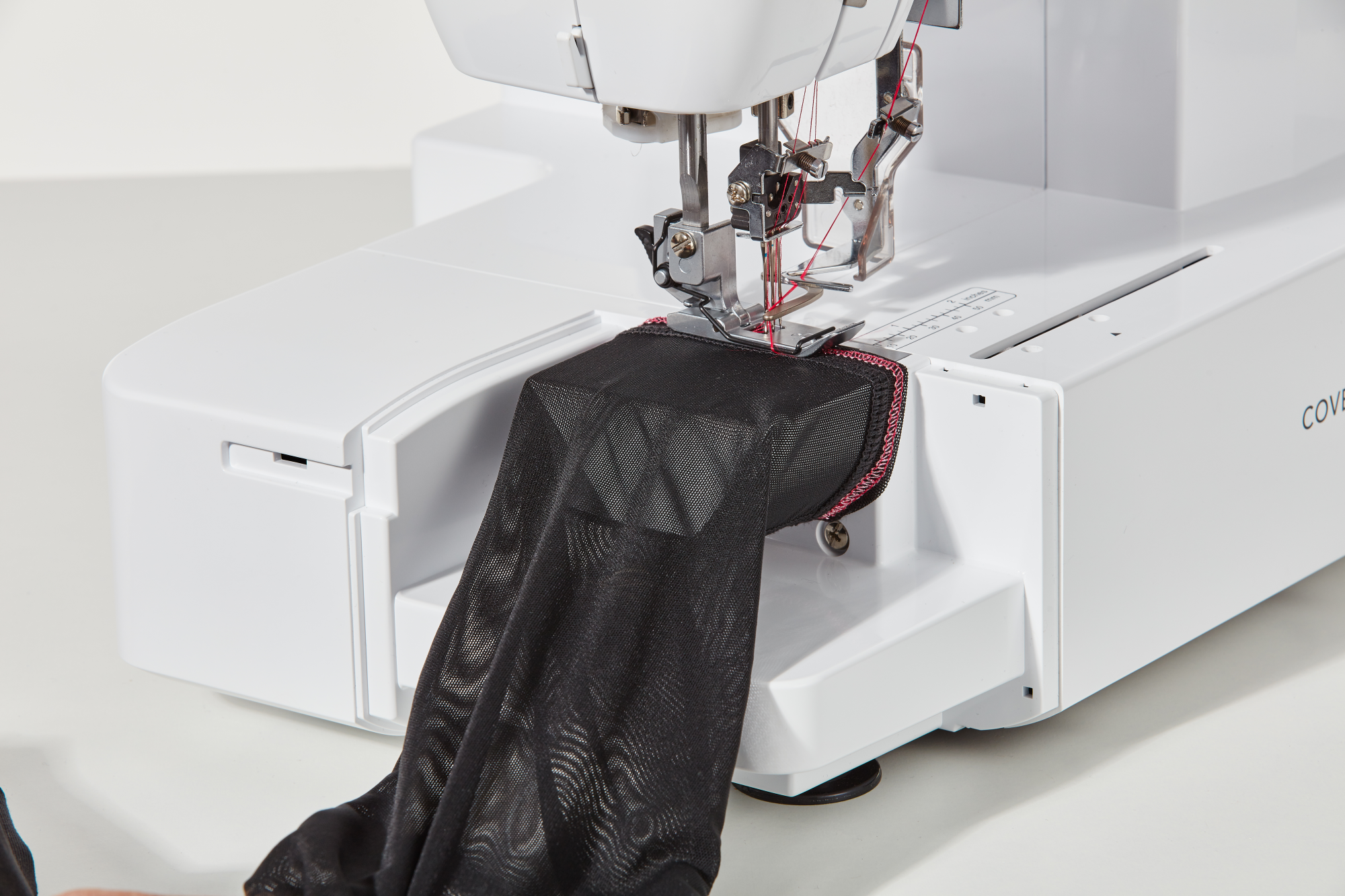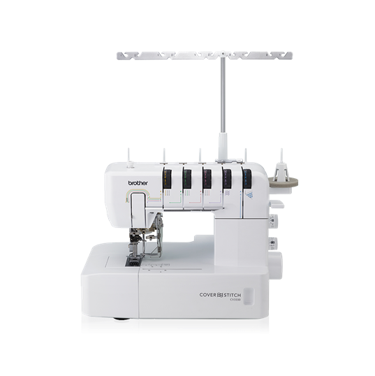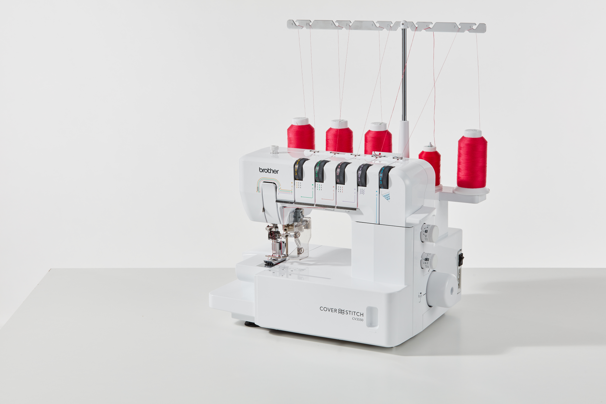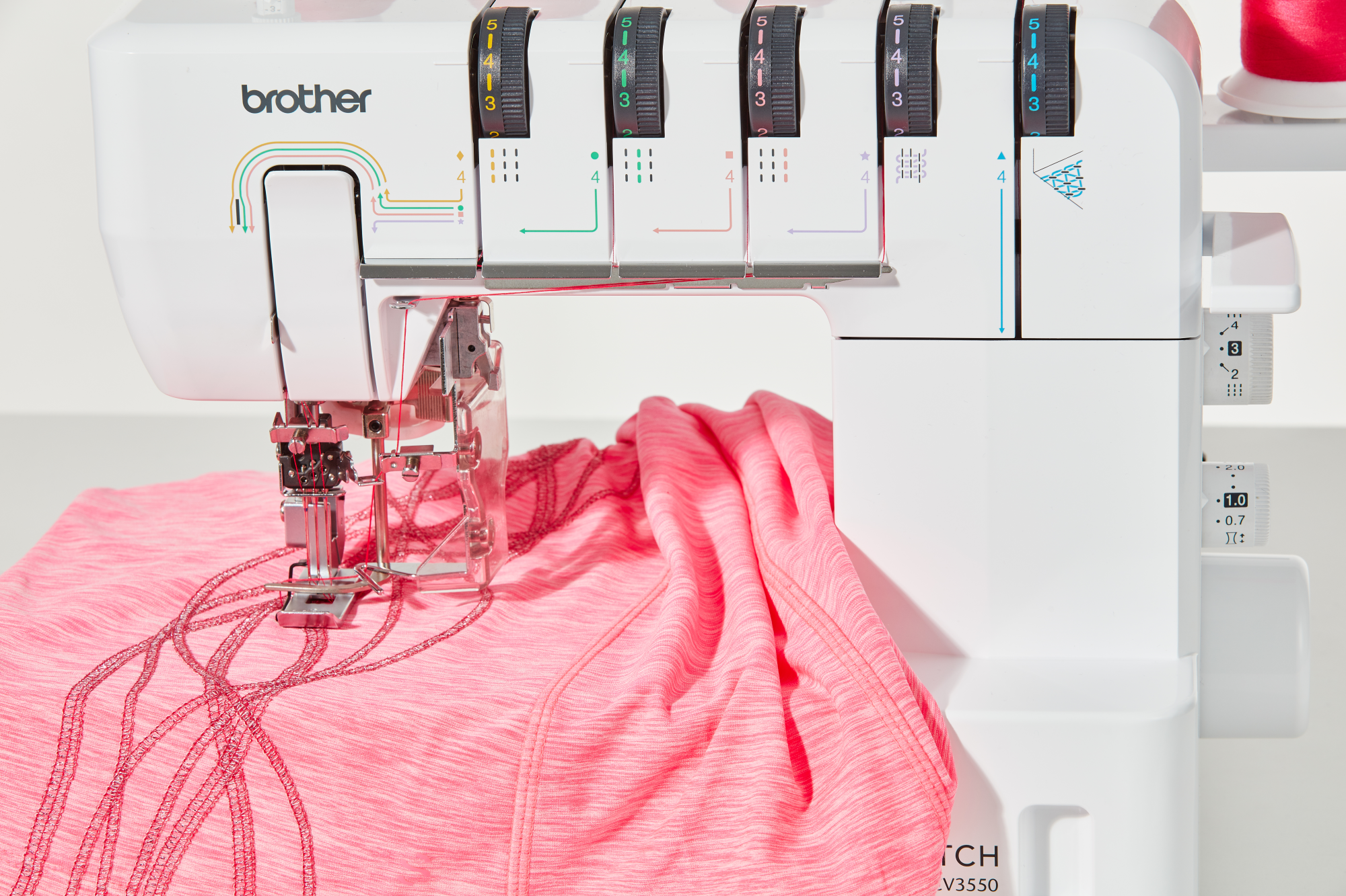 The CV3550 Double-Sided Cover Stitch allows you to create a wide range of cover stitches on all types and weights of fabric for both decorative and constructive applications. It features both single-sided and double-sided tri-cover stitches, wide cover stitches, narrow cover stitches as well as a chain stitch. Additional points include a free arm, LED light, thread cutter, color coded threading, easy looper and cover spreader threading, a presser foot pressure dial, and snap on feet. The adjustment dials for stitch length and differential feed are now conveniently located on the right-hand side. With 3 needles, one lower looper, and one cover spreader, the CV3550 creates not only professional hems, and chain stitching, but allows you to add double-sided cover stitching to your projects for a special one step finish previously unavailable!