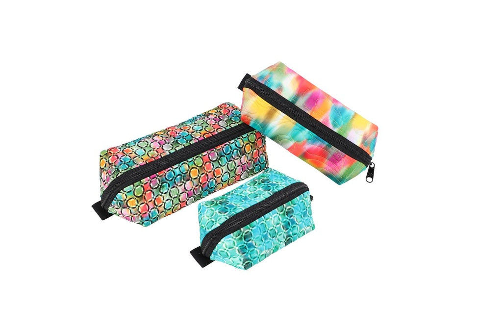 Multipurpose zippered pouches in three sizes open to create shallow trays that provide great visibility and easy access to contents. Use them to store and carry personal items or a variety of art, office, and craft supplies. Grab tabs make opening and closing easy. The optional hardware on one end may be used to attach a strap or other object.