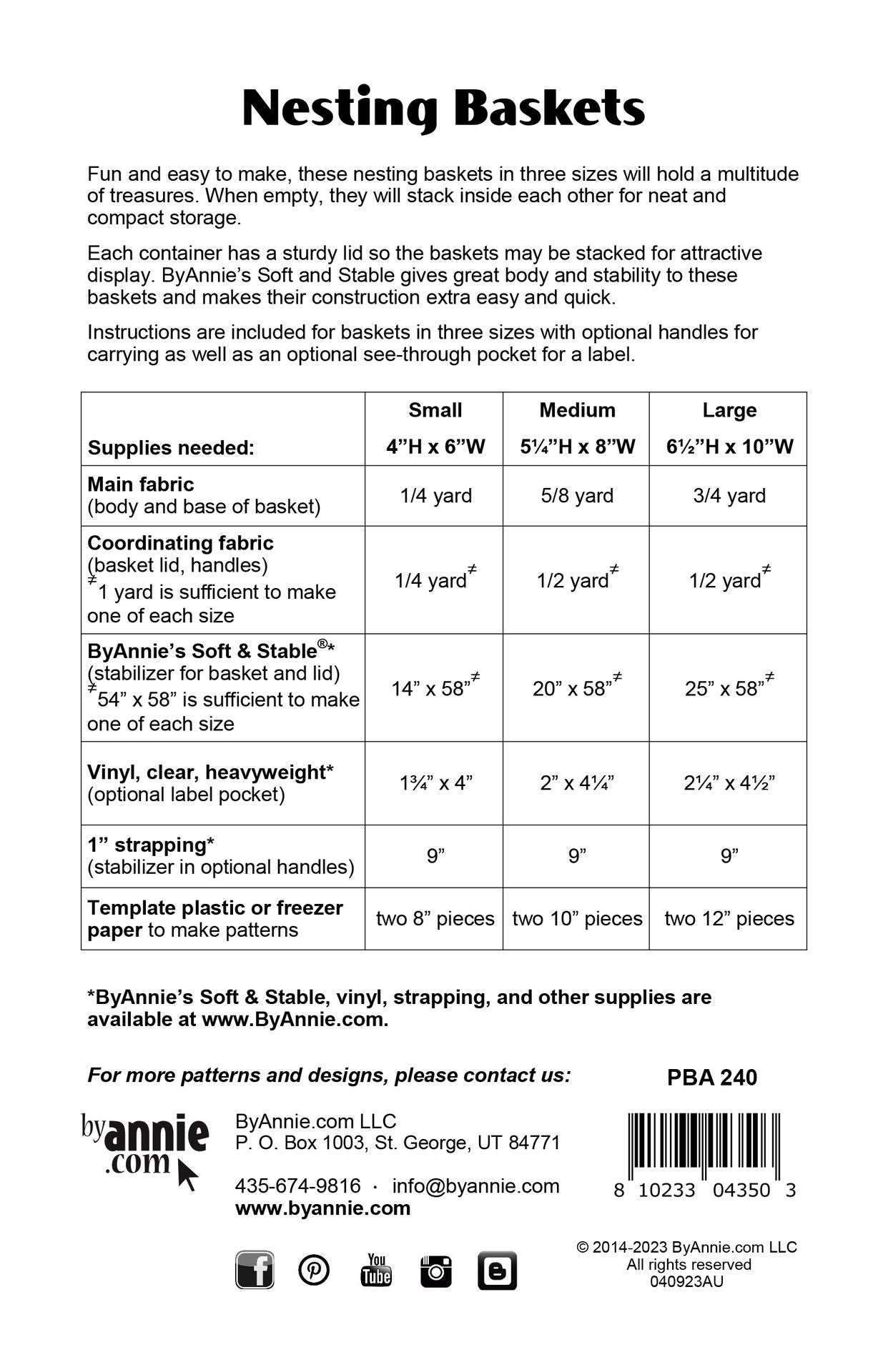 Fun and easy to make, these nesting baskets in three sizes will hold a multitude of treasures. When empty, they will stack inside each other for neat and compact storage. Each container has a sturdy lid so the baskets may be stacked for attractive display. ByAnnie’s Soft and Stable gives great body and stability to these baskets and makes their construction extra easy and quick. Instructions are included for baskets in three sizes with optional handles for carrying as well as an optional see-through pocket for a label. Perfect for the sewing room, bathroom, nursery, child's room, craft room — or anywhere in the house!