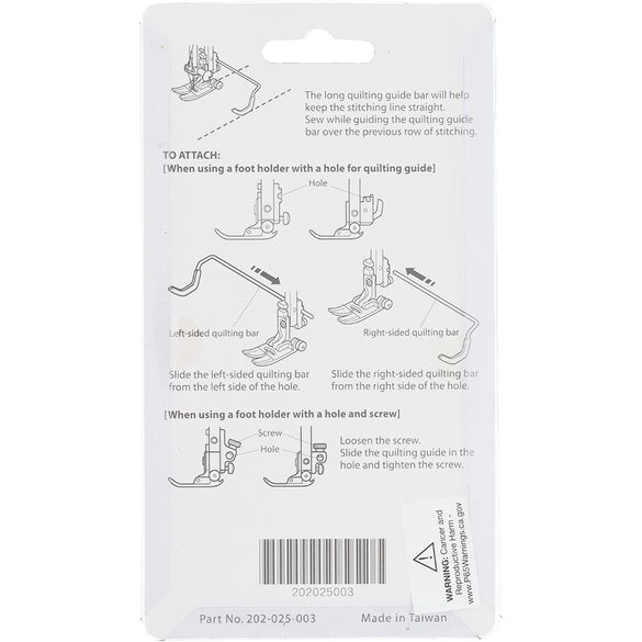 This set includes two guides that can be attached to the left or right of the needle to create parallel rows of stitching approximately two times wider than rows made with the regular quilting guide. Just snap one of the guides into place at the back of the even feed foot and adjust the distance from the needle as required. The guides can also be inserted into a regular foot holder.