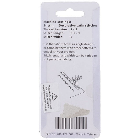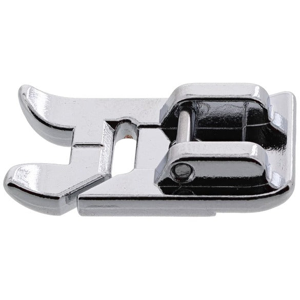 For sewing dense zigzag stitching. The bottom of the foot is beveled for smooth delivery of thread when sewing decorative or satin stitches. Foot is made of clear plastic making it easier to view stitching.