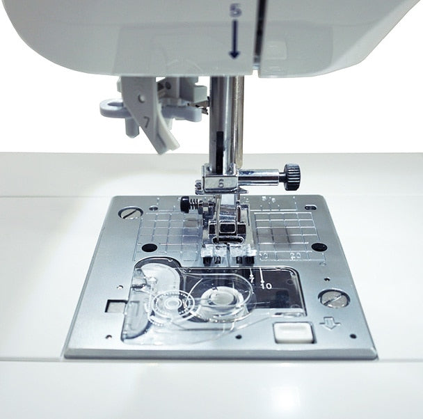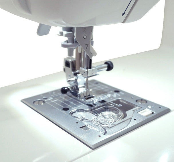 Presser foot can be raised and lowered by the knee-lifting lever. You now can have both hands free when trying to line up those hard to handle fabrics. The presser foot lift is up to 12 mm when the lever is used.