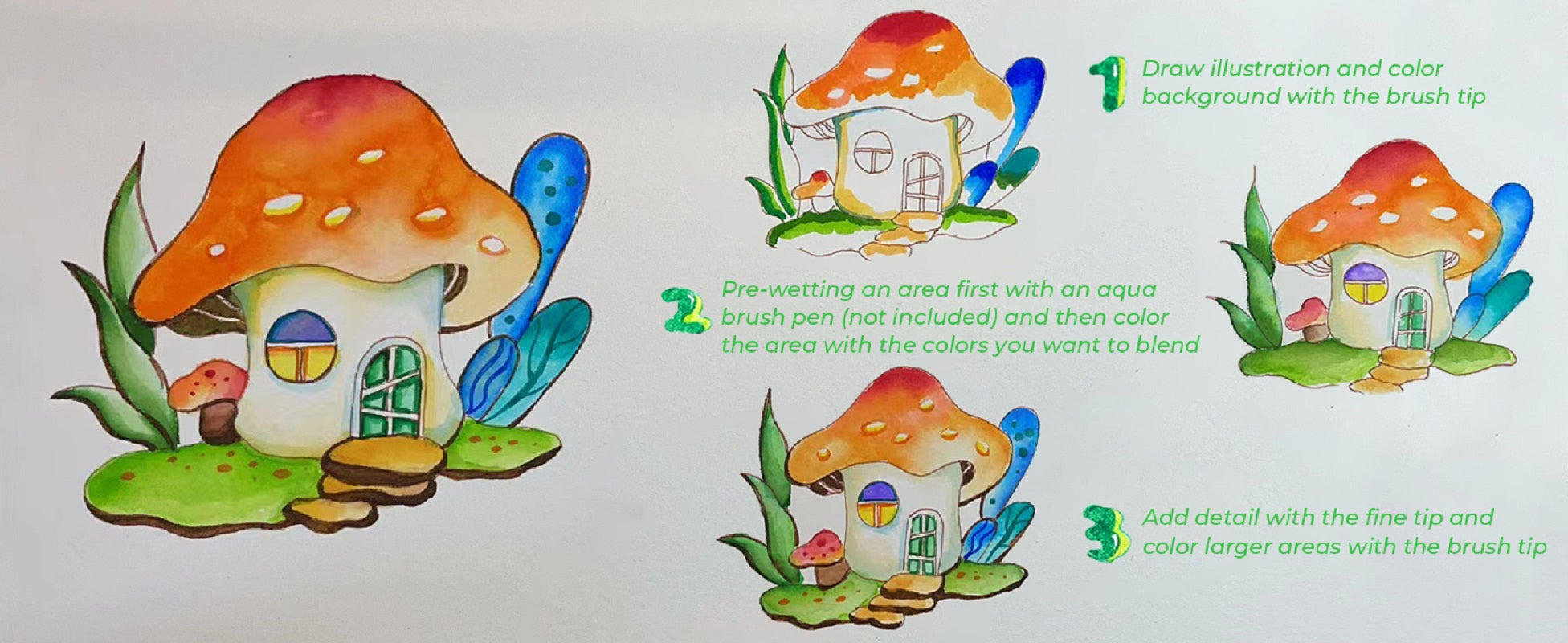 The ink is water-soluble and you can achieve beautiful watercolor effects by pre-wetting an area first with an aqua brush marker (not included) and then color the area with the colors you want to blend. Note: Since it needs water to blend the colors, please use watercolor paper or mix media paper to prevent bleeding.