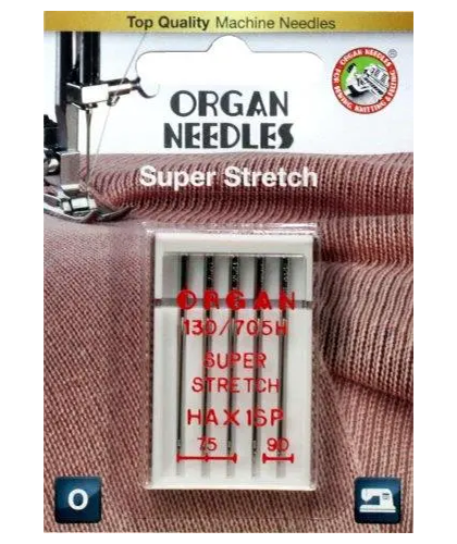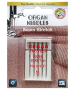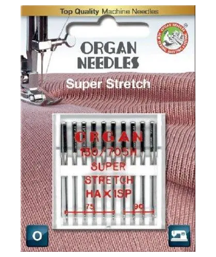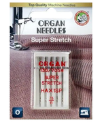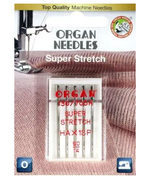 Organ Super Stretch Machine Needles, available in assorted sizes. These specialized needles feature ball points with a special eye for highly elastic materials. The snake head shape alleviates making holes, and the scarf avoids skipped stitches. Please consult your sewing machine's instruction manual to ensure you are purchasing compatible needles.