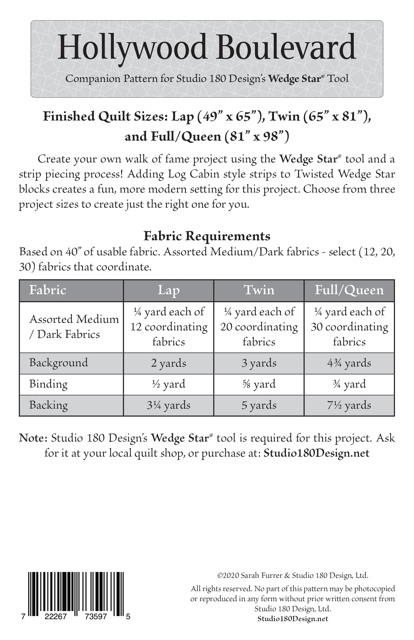 Create your own walk of fame using the Wedge Star® tool and a strip piecing process! Adding Log Cabin style strips to Twisted Wedge Star blocks creates a fun, more modern setting for this design. Choose from three project sizes to create just the right one for you.