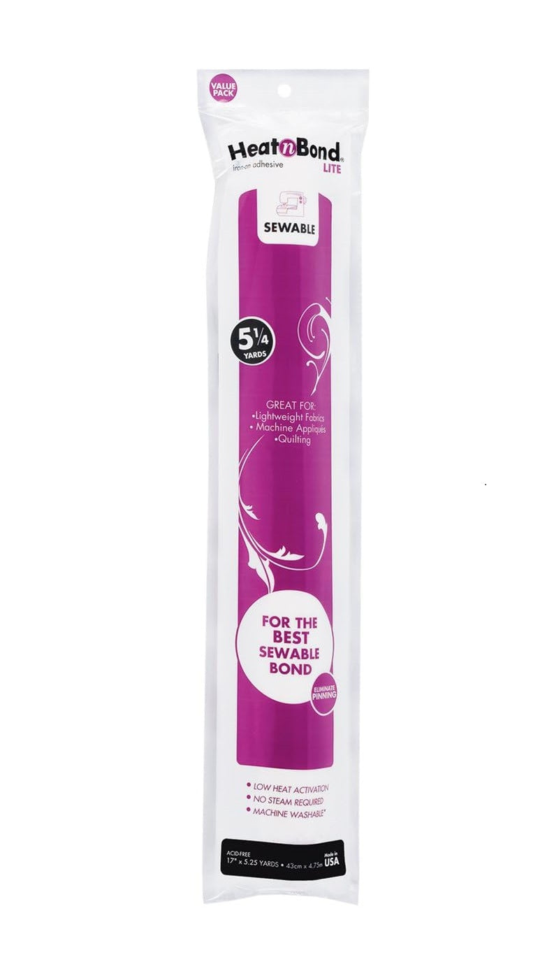 A paper backed sheet of solid lightweight, heat activated adhesive. HeatnBond® Lite is iron-on, sewable, double-sided adhesive for bonding fabric without extra weight or stiffness. Use it for appliqué shapes on quilts, wall hangings and attire. Draw or print directly on the paper backing to easily design appliqué pieces!