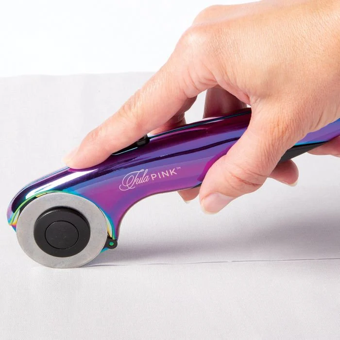 Tula Pink 45MM Ergonomic Rotary Cutter. Beautifully styled aluminum alloy rotary cutteris designed for both right and left handed cutting. It's curved handle design allows for even pressure while making clean cuts. It features a secure locking blade guard for safe usage and storage. This versatile cutting tool cuts fabric, leather, paper, vinyl, and more!