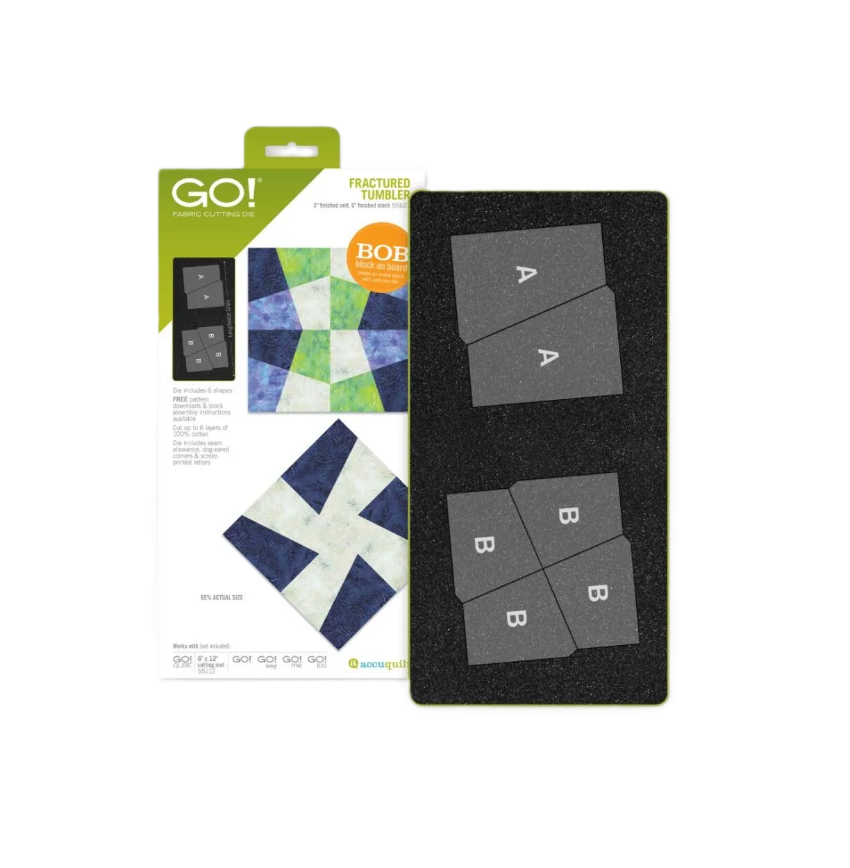 • Fractured Tumbler is a Block on Board® (BOB®) die which means it’s specially designed to cut four of each 3" finished blocks in one pass through the cutter in 3-color or 4-color designs. Combine four 3" blocks to make a 6" finished block.