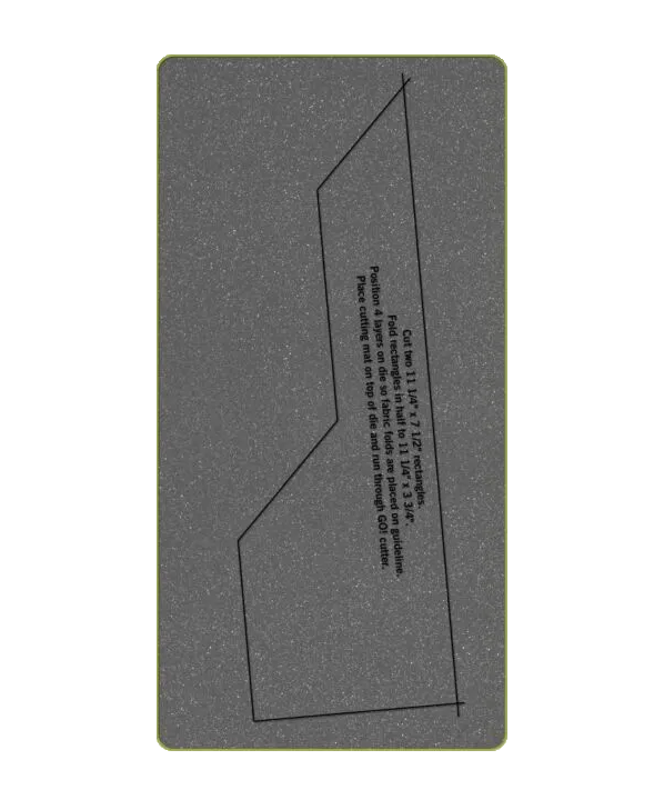• Fold each fabric and batting rectangle individual to 11 1/4" x 3 3/4". Position fabrics on the die with fold placed on the guideline. Then place batting on top in the same manner. Place mat on top and cut