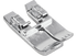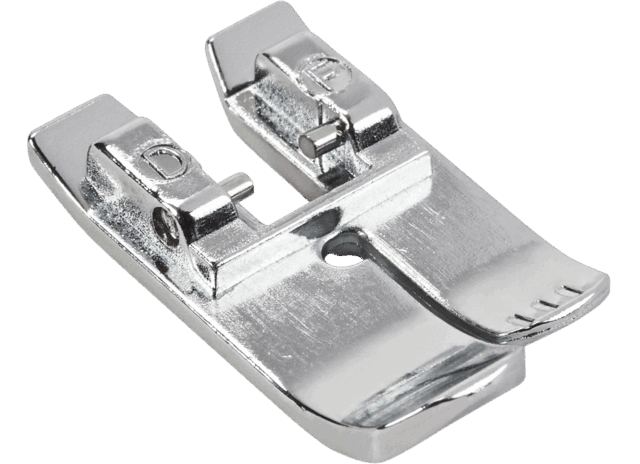 This presser foot is ideally suited for all straight-stitch work. The small stitch hole supports the material during sewing. The straight-stitch foot for Dual Feed is provided with a recess on the back side of the presser foot to activate the integrated Dual Feed. This allows an even feed of several fabric layers and “sticky” materials such as leather or plastic.