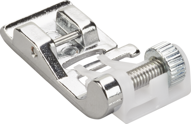 For couching sequin- and satin ribbon. The adjustable guide holds the ribbon in place, preventing it from slipping as it is being sewn on.