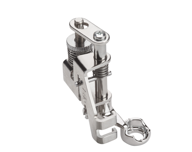 This foot allows you to sew along Plexiglas rulers to create decorative quilt designs such as lines, feathers, circles etc. Due to the adjustment dial the height of the foot can be adjusted to match the fabric thickness individually so that the fabric can be moved smoothly and without getting stuck.