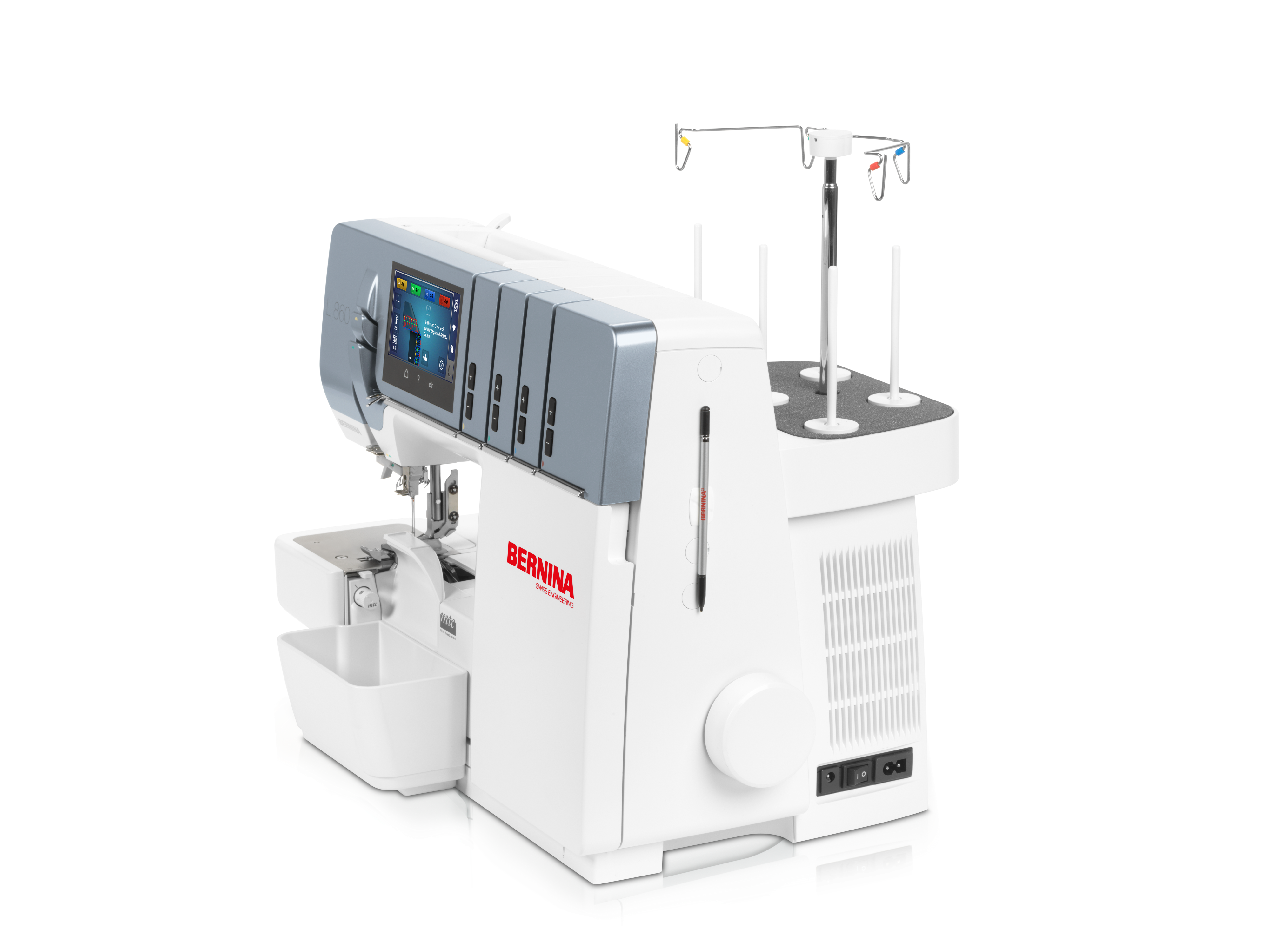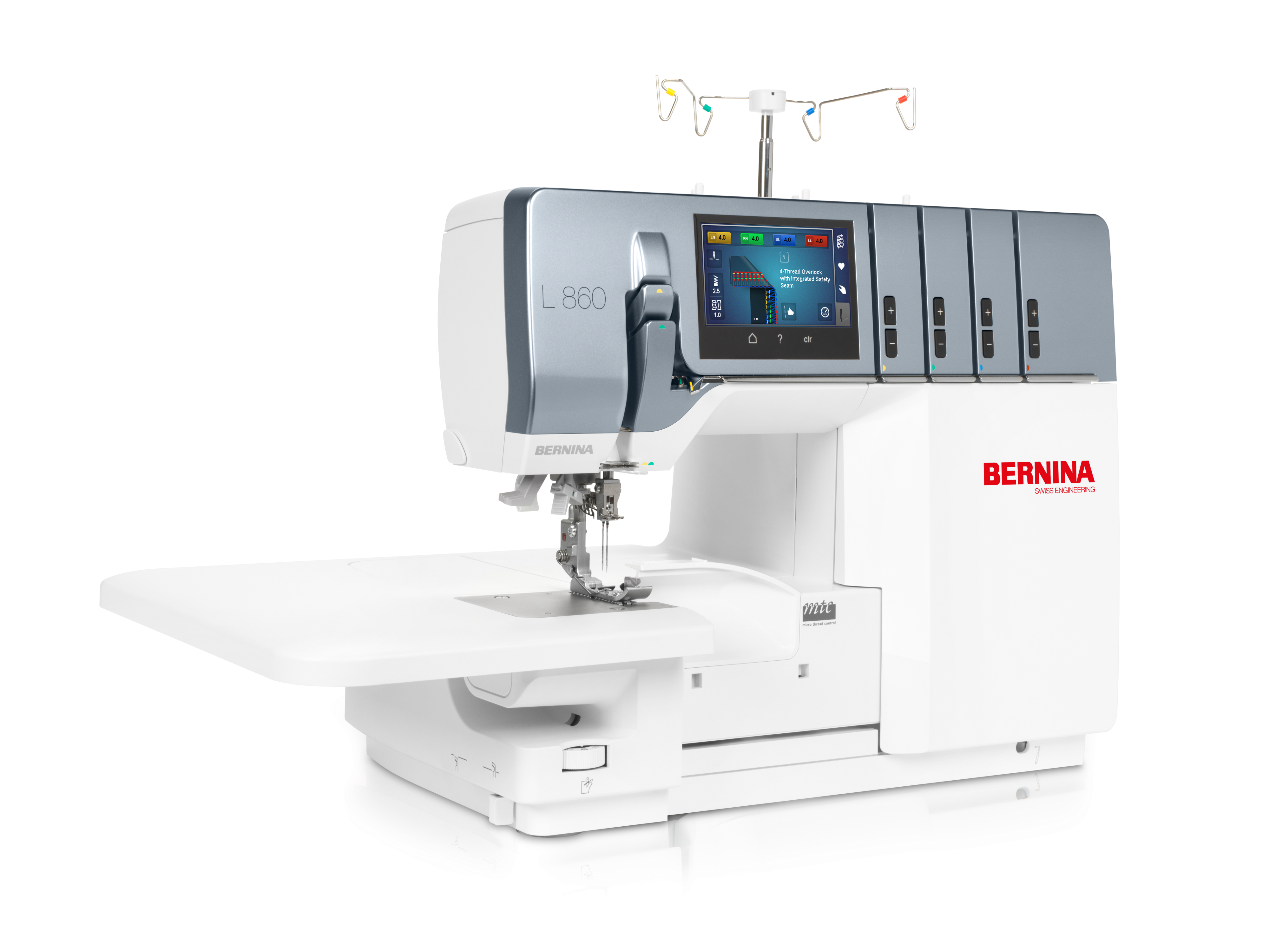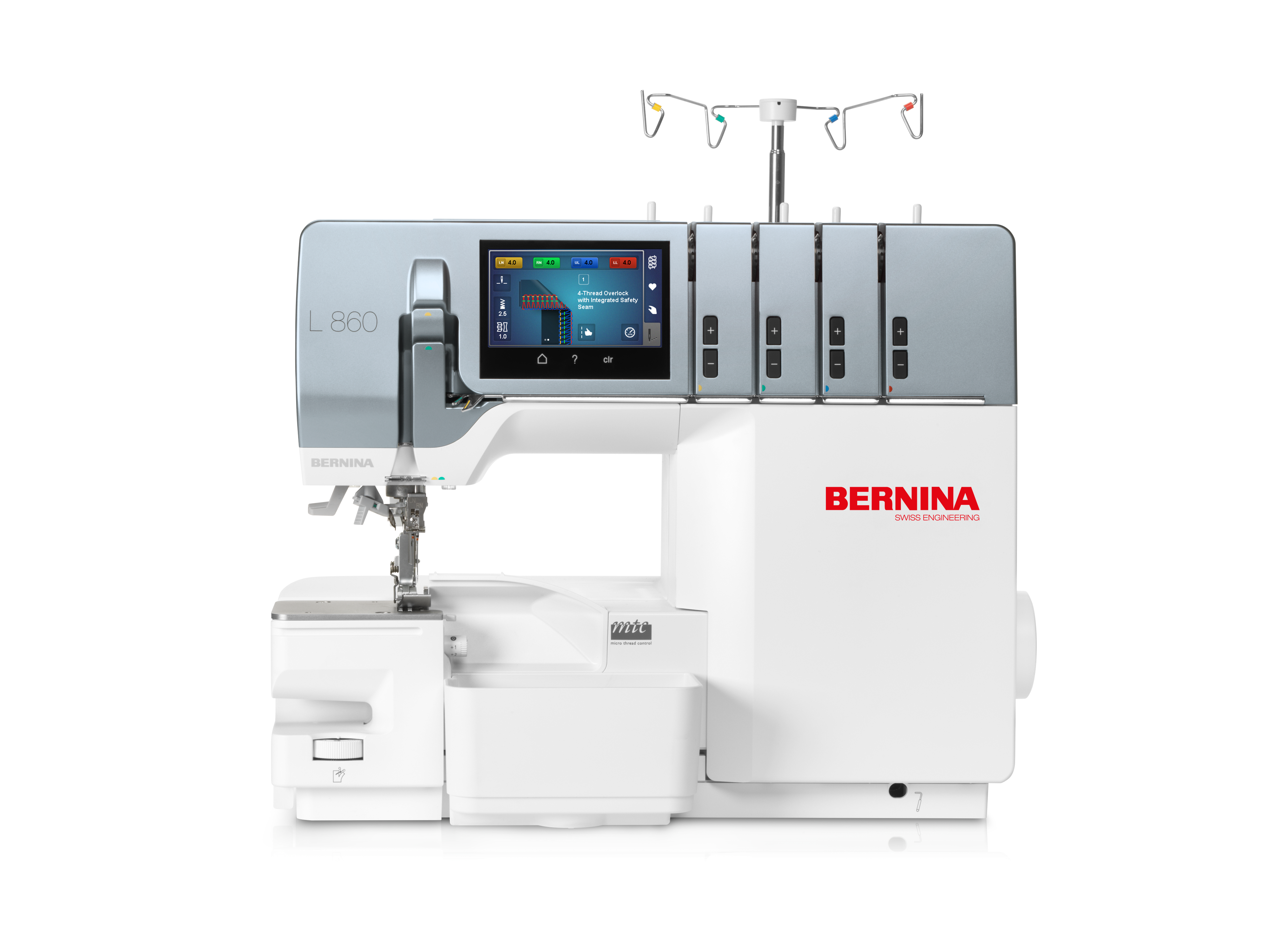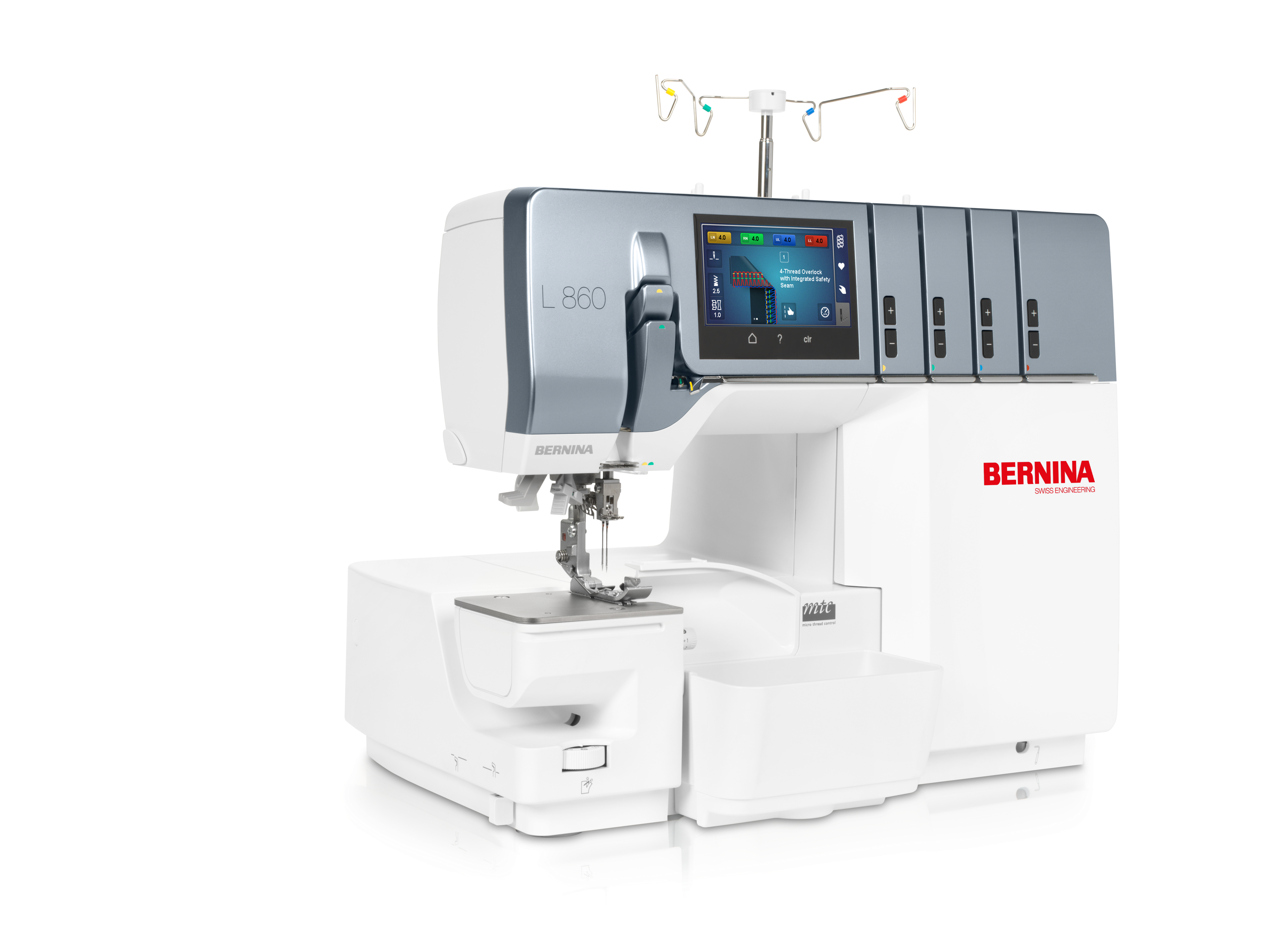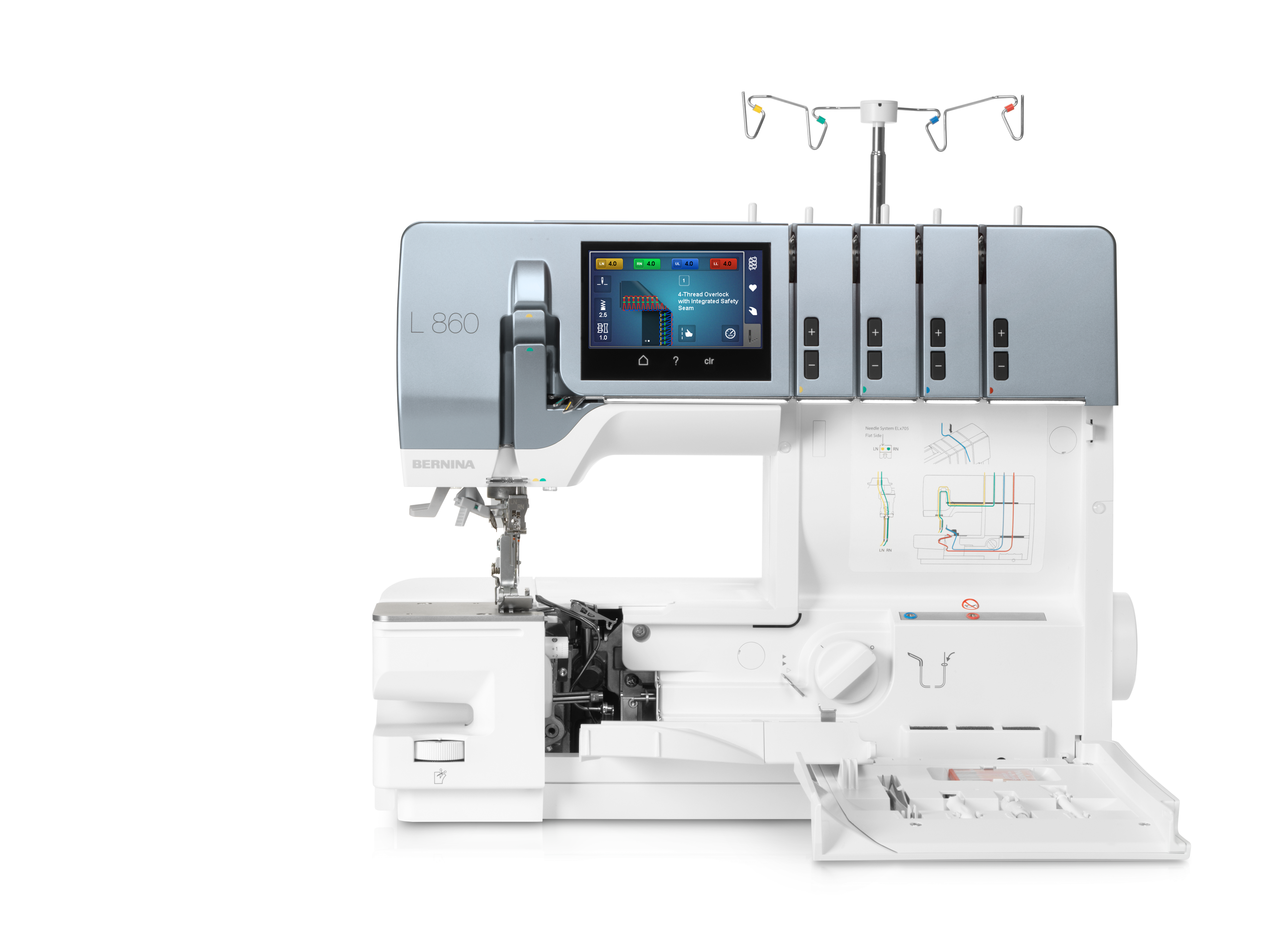 The BERNINA L 860 is a unique overlocker designed to handle various threads and fabrics, especially highly elastic and knitted materials. With an intuitive color touch screen, selecting stitches is a breeze. The standout feature of the L 860 is the exclusive One-step BERNINA Air Threader, which magically moves the looper threads through the machine using air with a simple step on the foot control. This innovative threading system saves time and ensures your hands are free to guide the threads, eliminating the need for manual thread positioning.