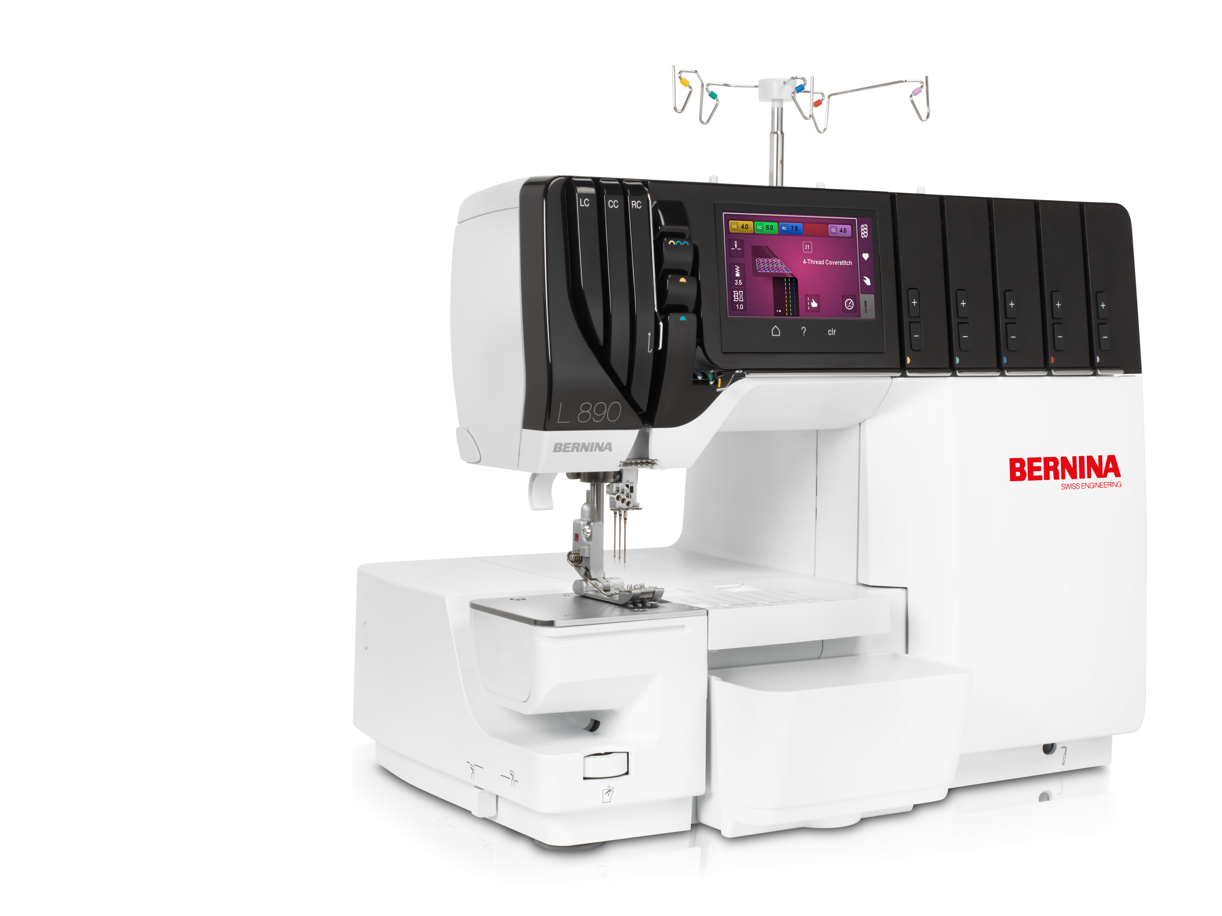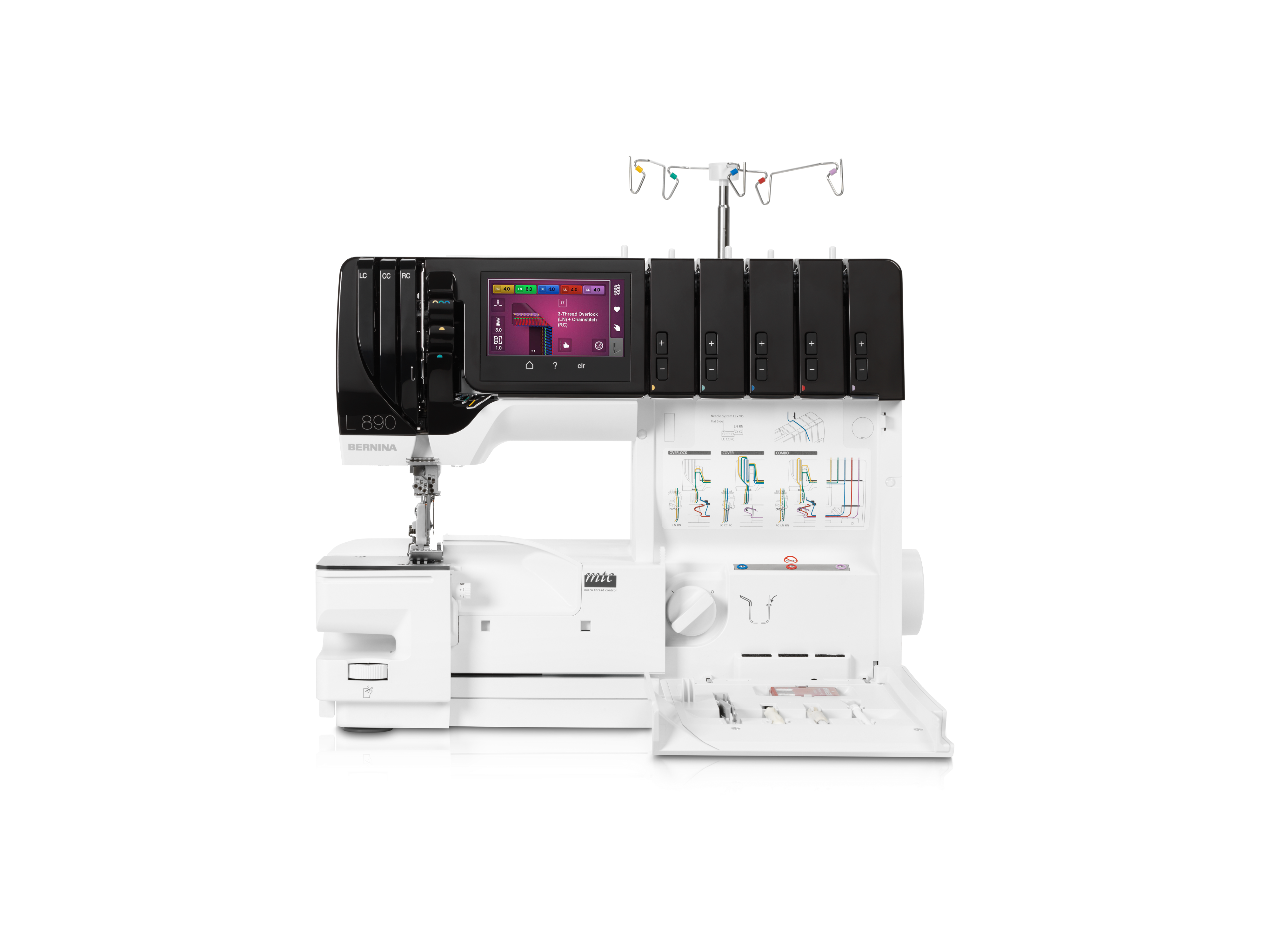 The BERNINA L 890 stands as a revolutionary machine in Overlock and Coverstitching, featuring an array of remarkable capabilities. The one-step BERNINA Air Threader offers a fun and straightforward threading experience. A simple press on the foot control magically moves the threads through the machine, freeing your hands and automatically setting the loopers in the correct position. The machine boasts intuitive operation via a centrally located color touch screen that provides stitch selection, individual stitch settings and properties, and a handy sewing consultant for both expert and guided modes. The BERNINA L 890 also allows you to save up to 100 stitches in your personal memory, adjust stitch length, differential feed, and thread tension while sewing, and make alterations with the mtc (Micro Thread Control) to modify the overedge thread amount.