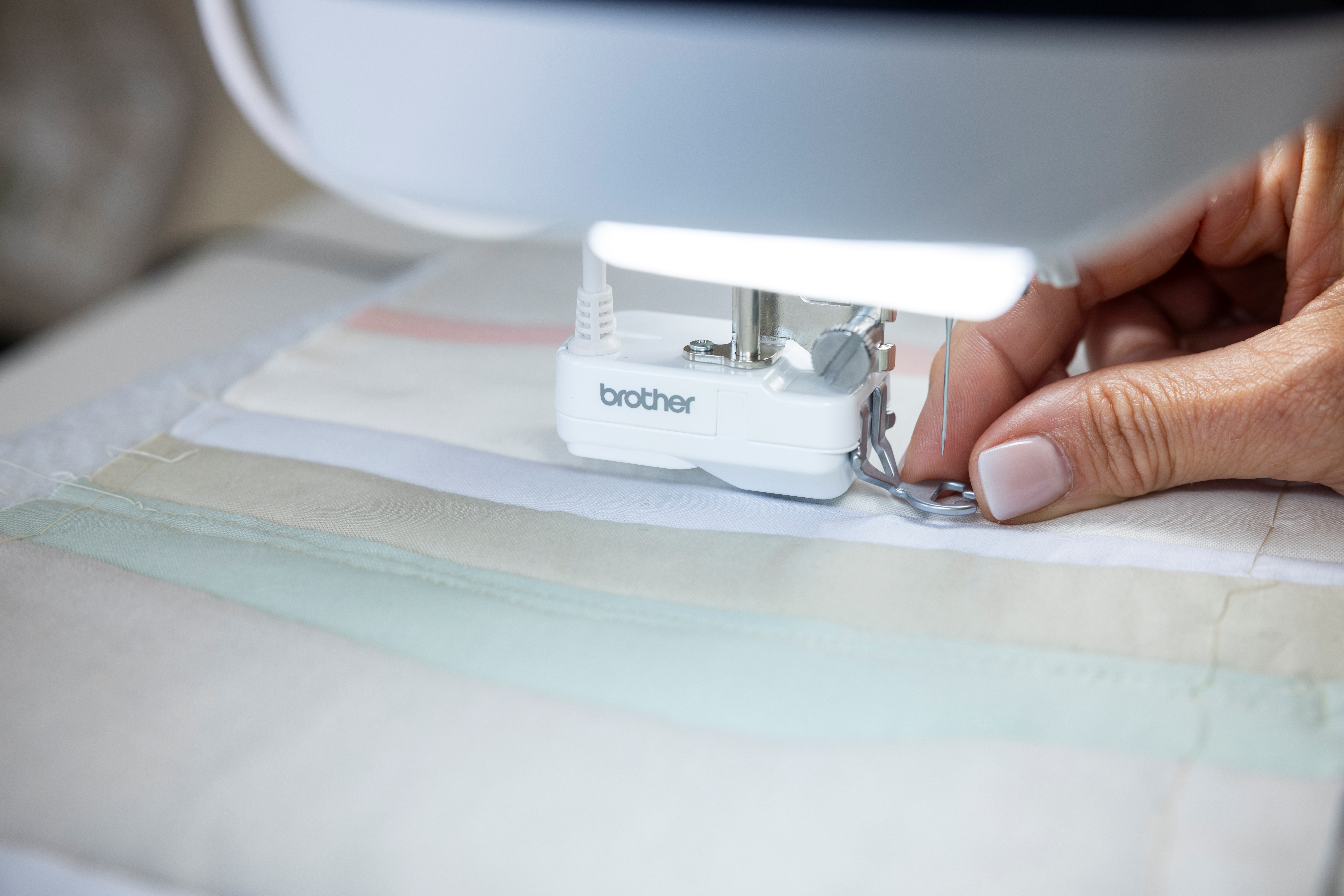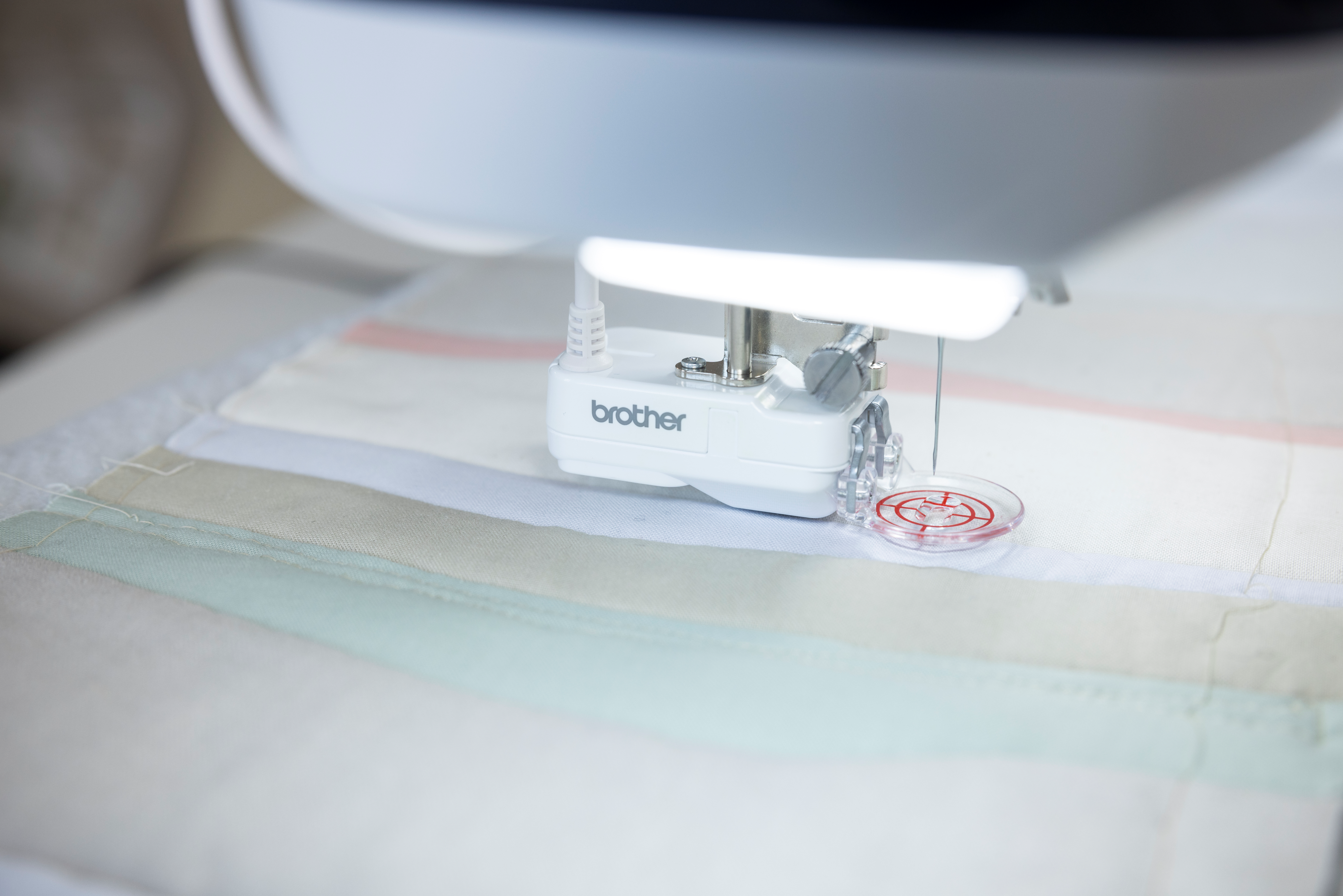 Intuitive infrared technology keeps stitch lengths even by adjusting the timing of the needle to match the speed of the fabric being fed through the machine and keeps the ISR operational in one of three modes: Continuous, Intermittent, and Basting. Its height can be adjusted easily in the settings, while the curved design of the included feet (Regular, Echo, and Open-Toe) keeps the fabric flowing effortlessly. There's a projected guideline for sensor positioning to show how close to the edge of the fabric you can go with the ISR. This Edge Detection System provides options for free-motion stitching - ideal for quilt projects of any size.