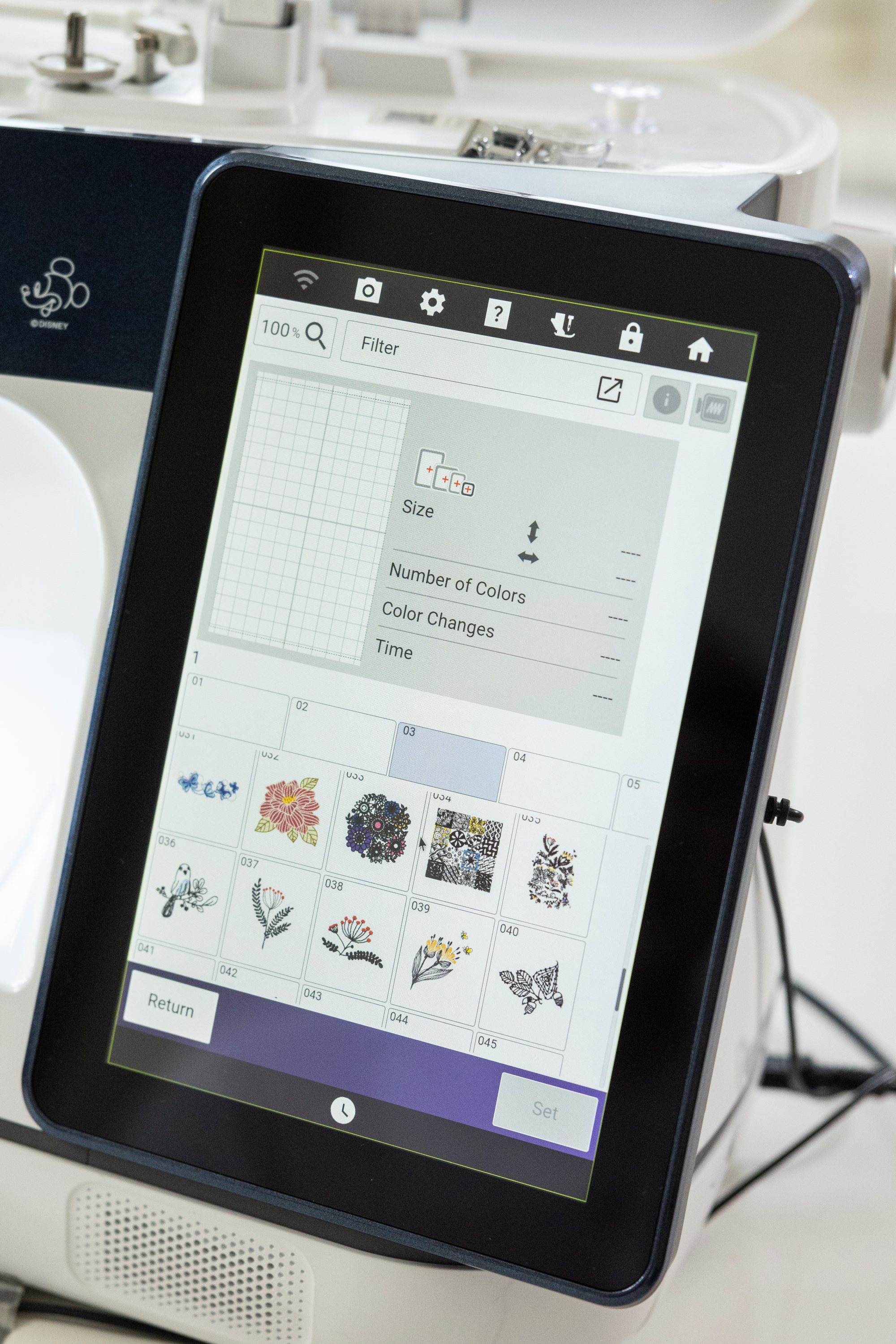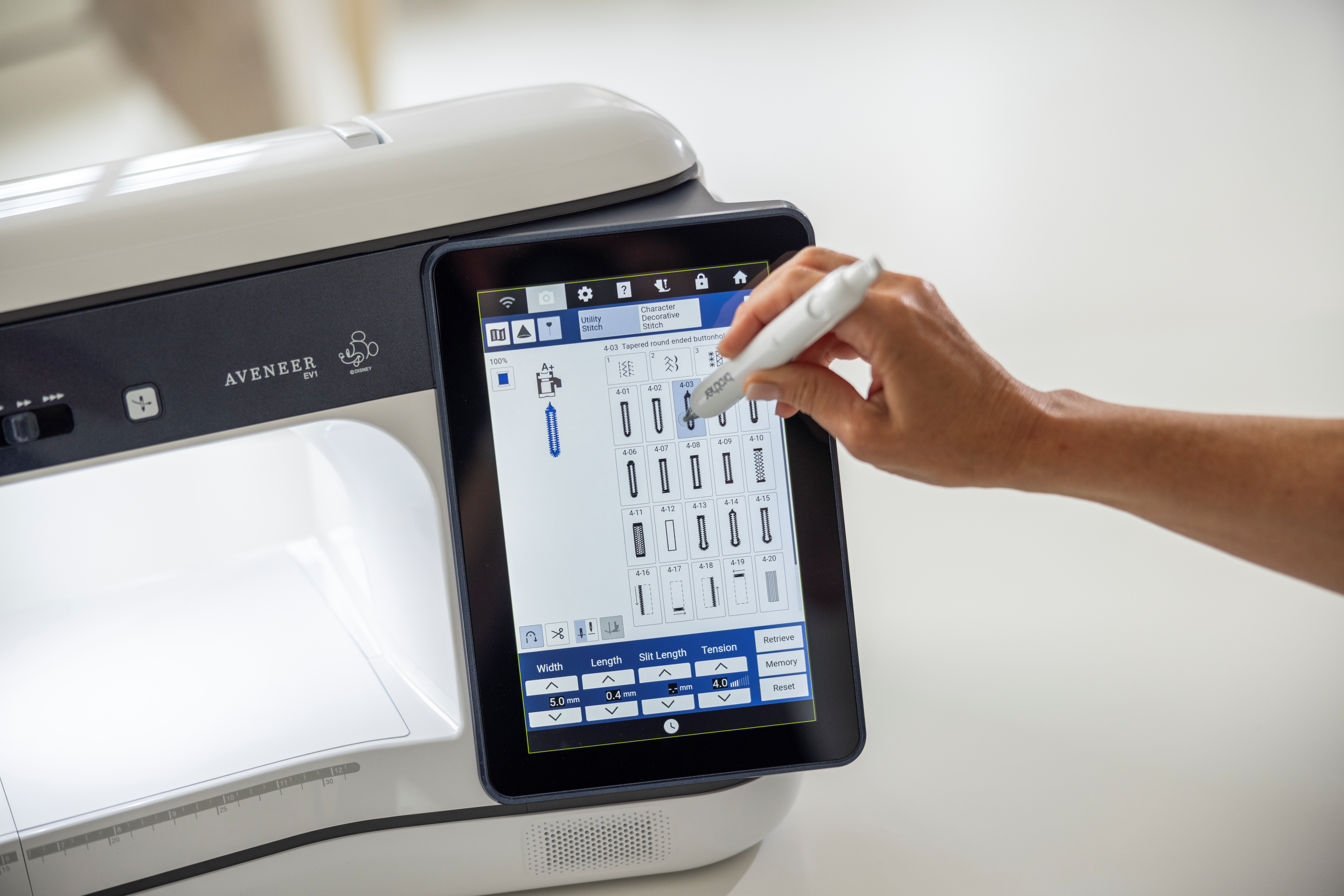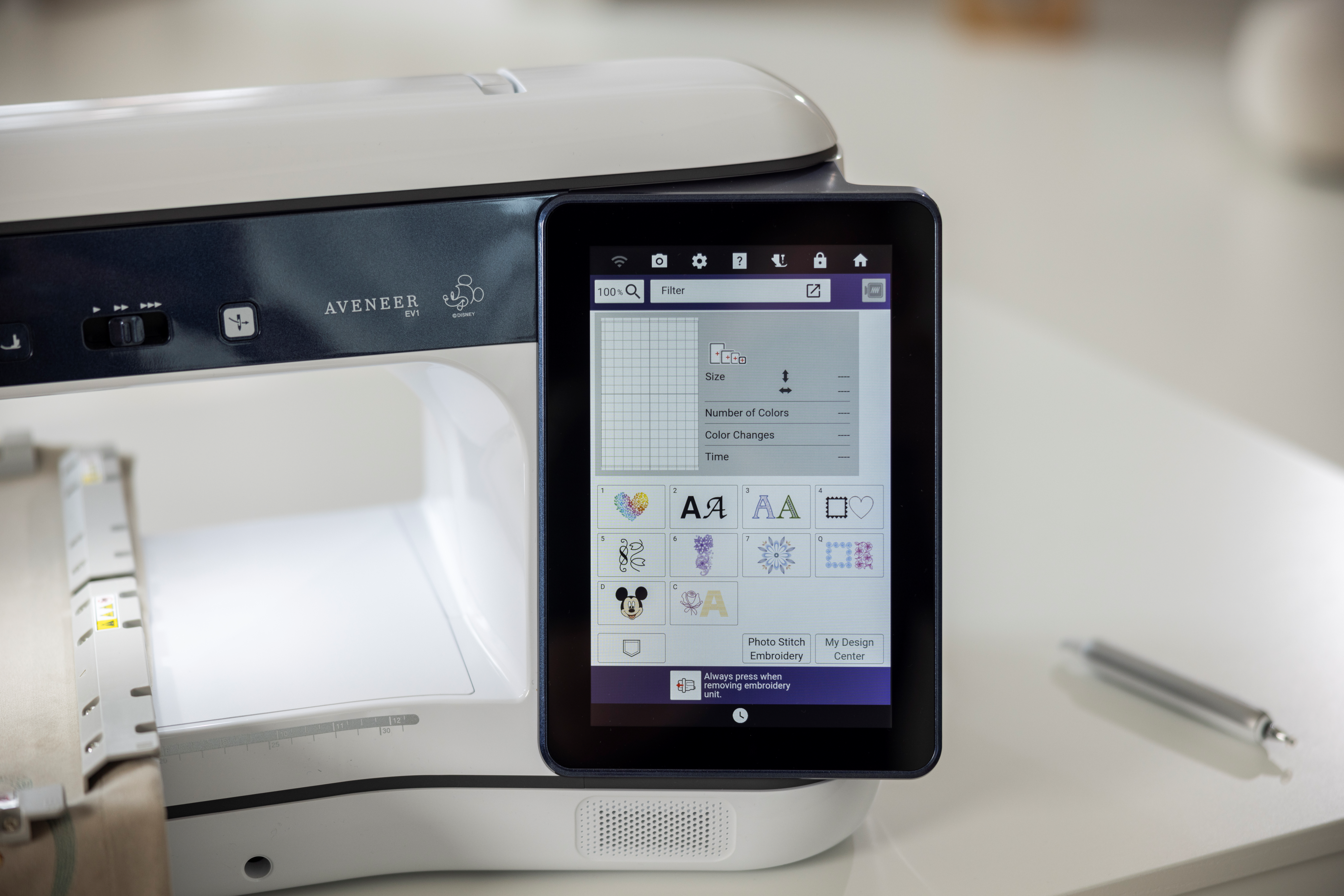 The control center of Aveneer EV1 displays more than 16.7 million color combinations with adjustable brightness for comfortable, strain-free viewing. Putting everything from basic operations to advanced embroidery functions at your fingertips, it's an incredibly useful tool for reviewing detailed steps, categories, and browsing designs. With intuitive navigation similar to a tablet, it responds to familiar sliding, swiping, scrolling, and pinch-to-zoom actions.