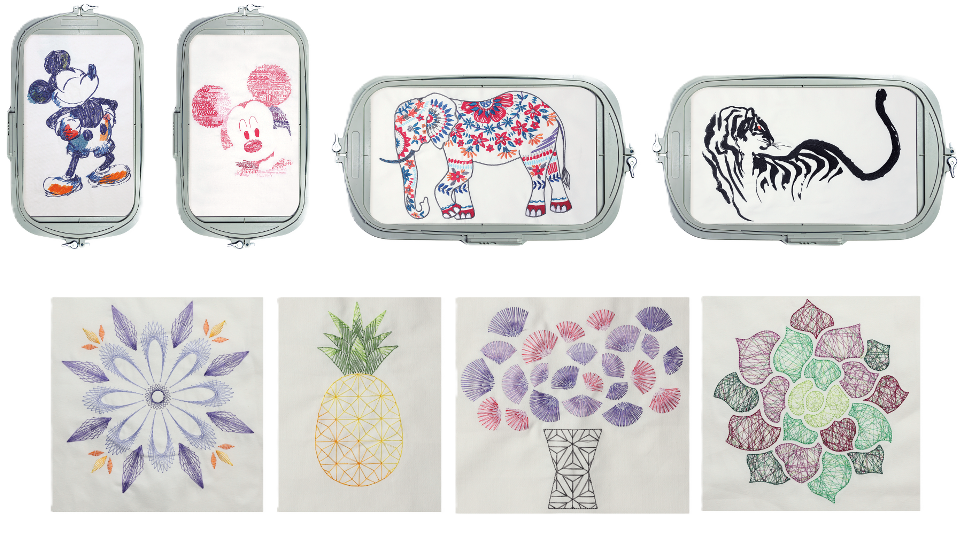 Explore the expansive library of 800 sewing stitches and 1858 embroidery designs. Browse through 31 fonts, 13 new quilt designs, and 4 appliqué patterns. Set your sights on the 8 imaginative botanical patterns or 6 realistic animal designs - including an elephant, tiger, and butterfly. There are 2 new large split patterns (for 7 in total) and a new alphabet pattern set. For Disney enthusiasts, there are 217 Disney character patterns to check out, including 13 additional modern and 6 new vintage Mickey Mouse designs, one new Pooh and Princess design, and two each from Pixar and film designs. Inspired by colorful string art, 18 long-stitch patterns bring a unique geometric element to almost any project. Lending plenty of visual interest, these patterns can be used to create long stitches for dramatic and eye-catching embellishment.