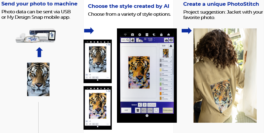 Elevating personalization to soaring new levels, the Aveneer EV1 uses AI (Artificial Intelligence) technology to transform photos or images into thread art - directly on-screen. With a choice of ten embroidery conversion functions, the Picture Play Embroidery function is a meaningful feature that grants users the ability to effectively "paint with thread."