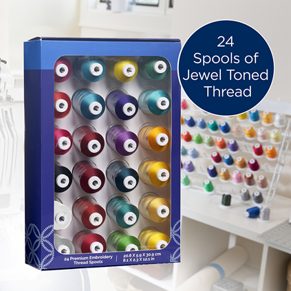 ¡Presentamos el juego de 24 piezas de la serie Trend de Brother, tono joya! Este juego cuenta con 24 colores en tonos de joyas en 1100 yardas. El hilo de bordar es 100% poliéster y un accesorio perfecto para sus proyectos de bordado de Brother. ¡Dé como regalo o guarde para sí mismo!
