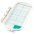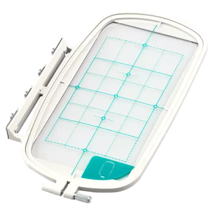 Cree diseños extra grandes sin cambiar la posición de la tela. Combine varios diseños pequeños para crear un diseño más grande. No es necesario volver a colocar el aro. Rejilla transparente con muescas para una colocación precisa de los diseños de bordado. Marcas en el aro para una fácil referencia.