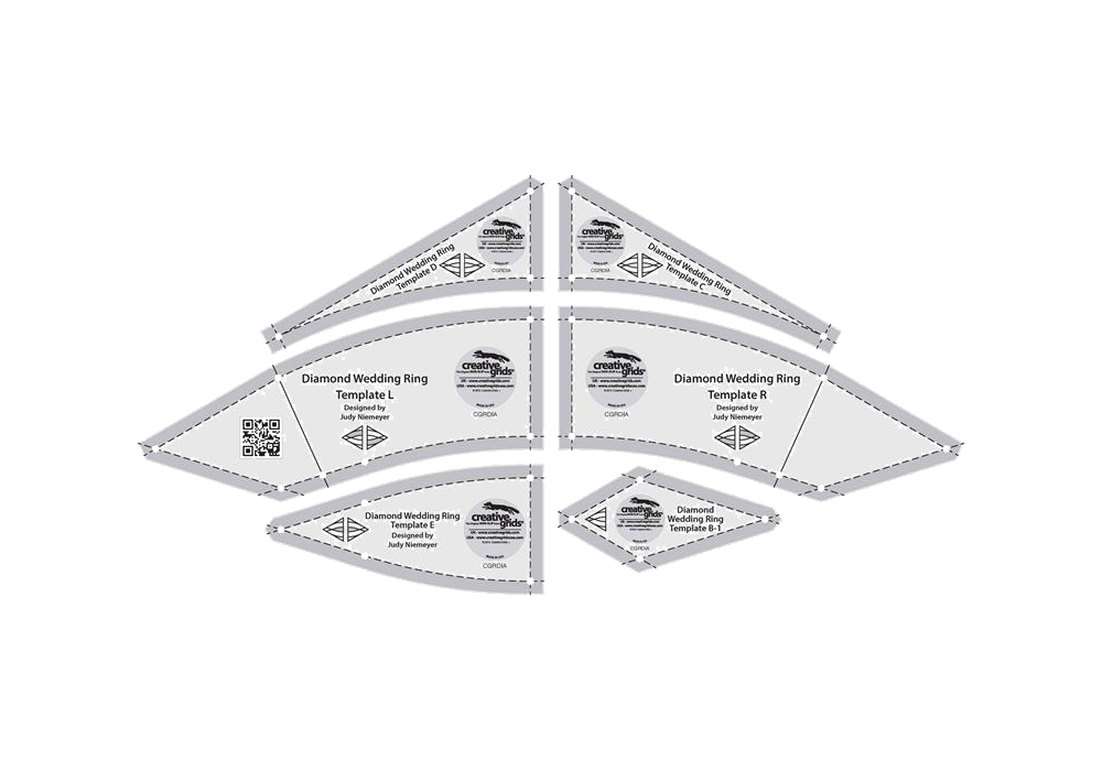 Las plantillas diseñadas por Judy Niemeyer funcionan con el patrón de empalme de papel de su anillo de bodas con diamantes. Utilice estas plantillas para cortar los segmentos necesarios para crear también otros edredones de diamantes para anillos de bodas. Estos ángulos funcionan con la regla de 60 grados de Creative Grids (Artículo #CGRT60). Corta las curvas con un cortador de 45 mm o 60 mm.