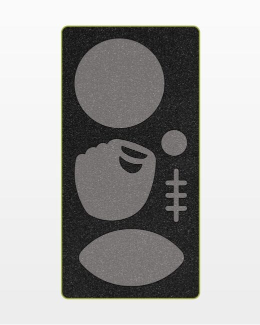 • Tamaño terminado: Balón de fútbol de 2 5/8" de ancho x 4 3/4" de alto (6,7 cm x 12,1 cm), balón de baloncesto/fútbol de 4" de ancho x 4" de alto (10,2 cm x 10,2 cm), guante de béisbol de 3 5/8" de ancho x 3 3/4"H (9,2 cm x 9,5 cm), béisbol 1 1/8"W x 1 1/8"H (2,9 cm x 2,9 cm) y puntadas de fútbol americano 1"W x 2 1/2"H (2,5 cm x 6,4 cm).