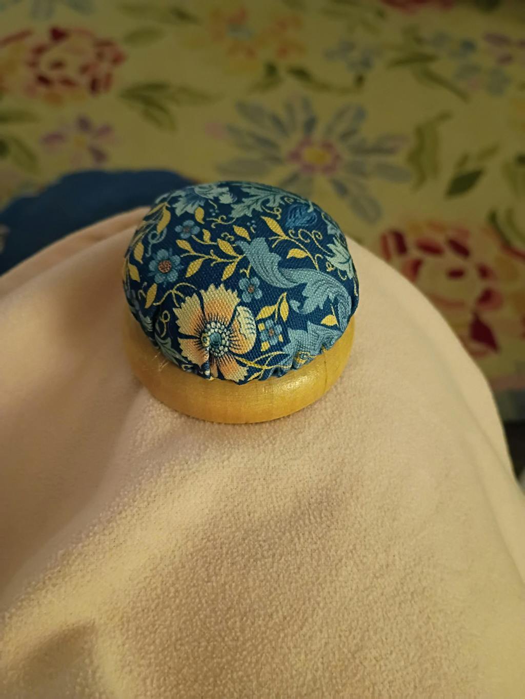 Cotton top pincushion, polypropolene stuffing, with wooden base. 2-3/8" diameter x 1-5/5" tall.