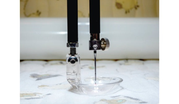 4. Ensure the foot is centered over the hole in the needle plate and that the needle is centered in the foot. Then fully tighten the screw with the 2.5mm hex wrench.