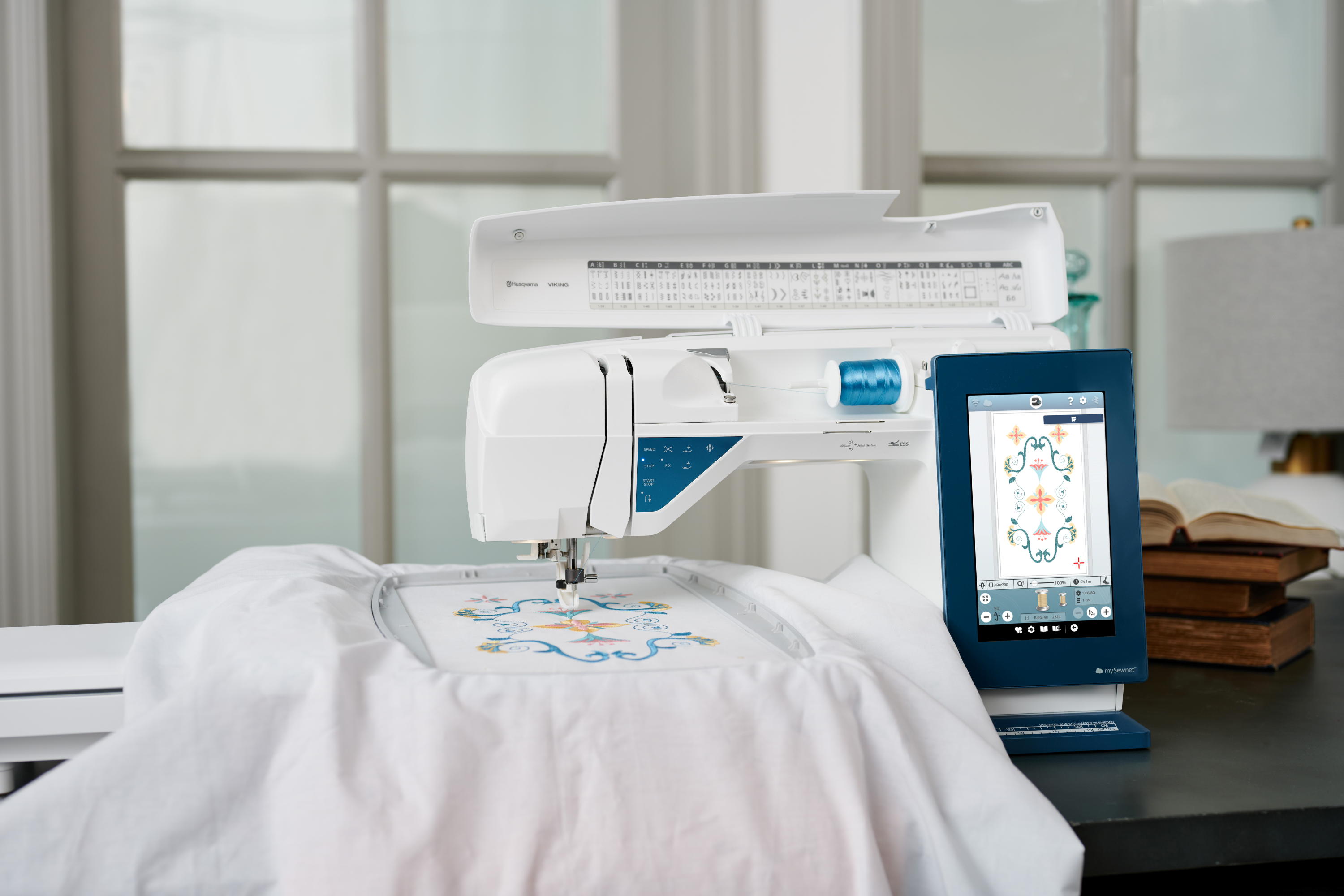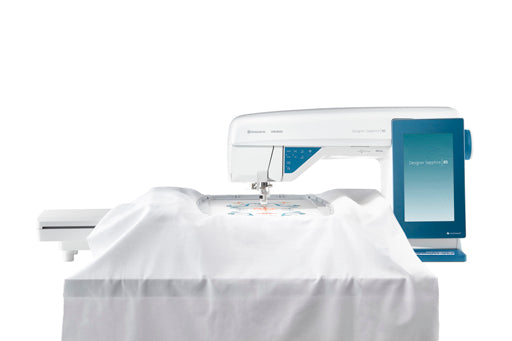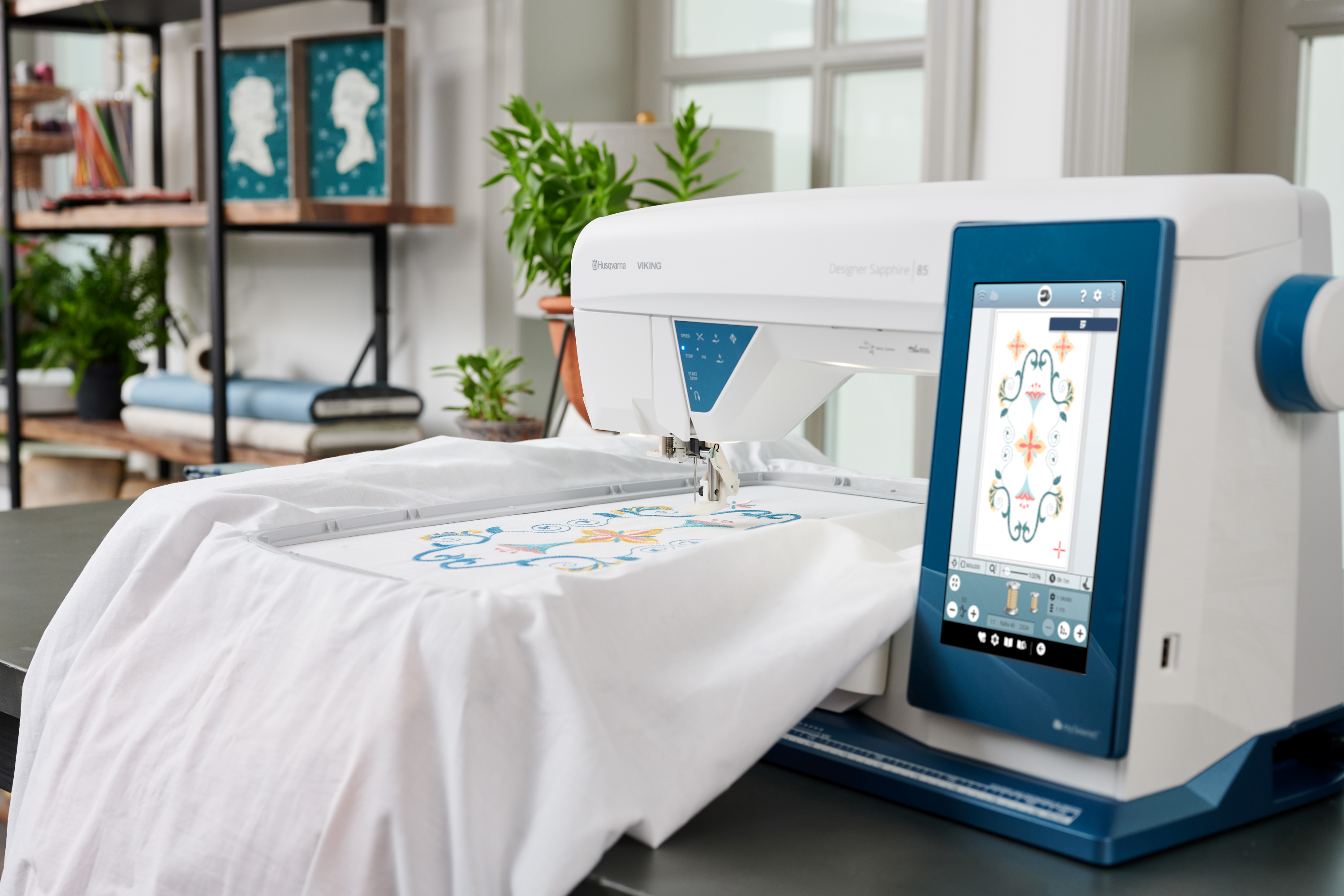Introducing the HUSQVARNA® VIKING® DESIGNER SAPPHIRE™ 85, a sewing and embroidery machine that is designed to inspire your creativity and take your sewing projects to the next level. This machine is perfect for those who love to settle into their favorite nook and create their sewing story. With its advanced technology and industry-leading features, you will be captivated by the DESIGNER SAPPHIRE™ 85. It is mySewnet™ enabled, allowing you to connect to mySewnet™ apps, update your machine, wirelessly transfer designs between devices, and more. It also gives you access to a continuously growing library of high-quality embroidery designs directly on the screen.