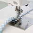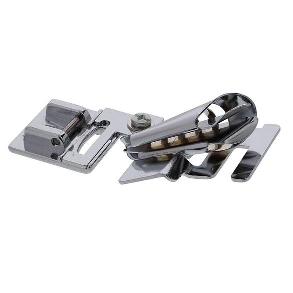El prensatelas para encuadernación se utiliza para aplicar cinta de encuadernación al bies predoblada o cinta al bies que haya cortado usted mismo en el borde de la tela en un solo paso. Está equipado con un pequeño embudo para doblar y guiar la unión sobre el borde de la tela antes de que llegue a la aguja y se puede usar con puntadas en zigzag o decorativas, así como con puntadas rectas.