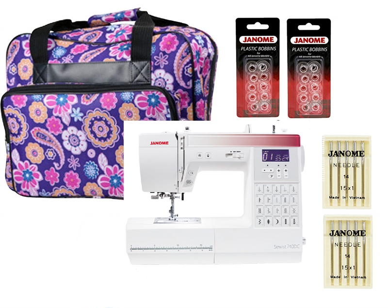 The Janome Sewist 740DC is a really easy-to-use, fully computerized sewing machine that is packed with so many powerful features. This machine has 40 stitches for a variety of applications. Direct stitch selection is available for 20 stitches and 20 are pictured on the easy access slide-out stitch chart.  When a stitch is selected the LCD screen shows, the selected stitch, recommended foot, default stitch width, and length, which you can change to suit your requirements. The Sewist 740DC also offers a choice of 3 styles of one-step buttonholes.