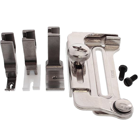 This set of 3 presser feet and gauge is perfect for professional sewing techniques including leather and vinyl work as well as attaching decorative piping and zippers with a fixed seam allowance.