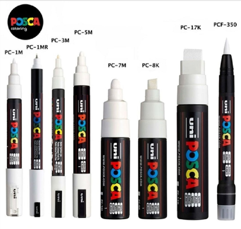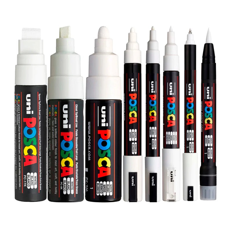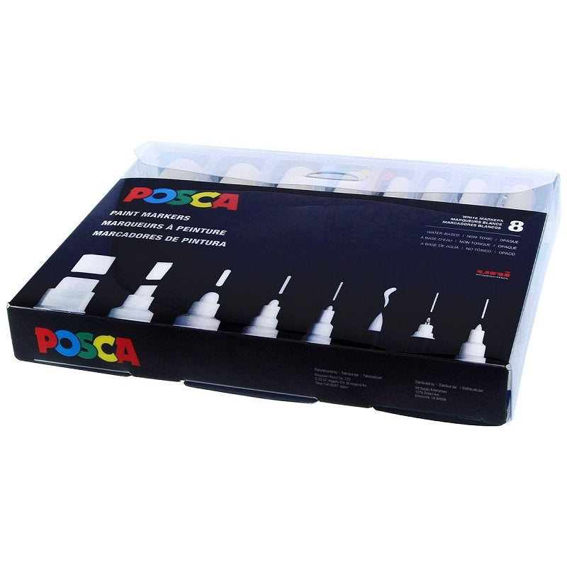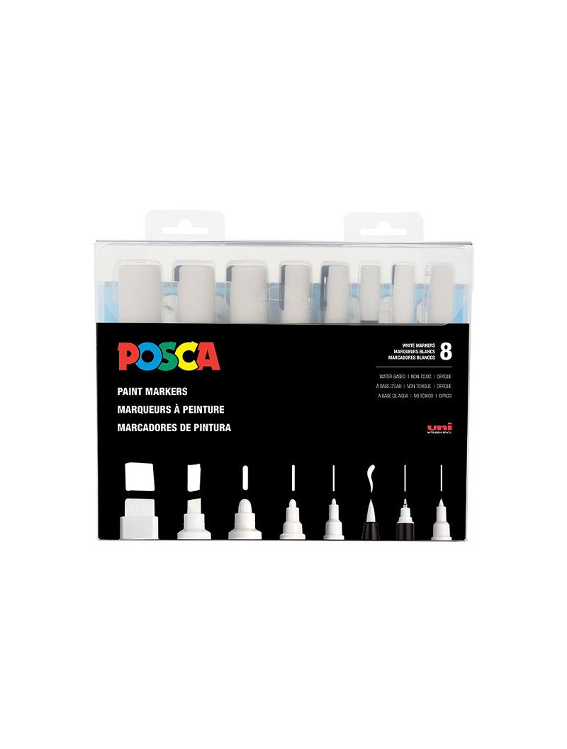 This 8-piece POSCA marker set features white markers that cover the full range of POSCA tip sizes - from ultra-fine to broad tip.