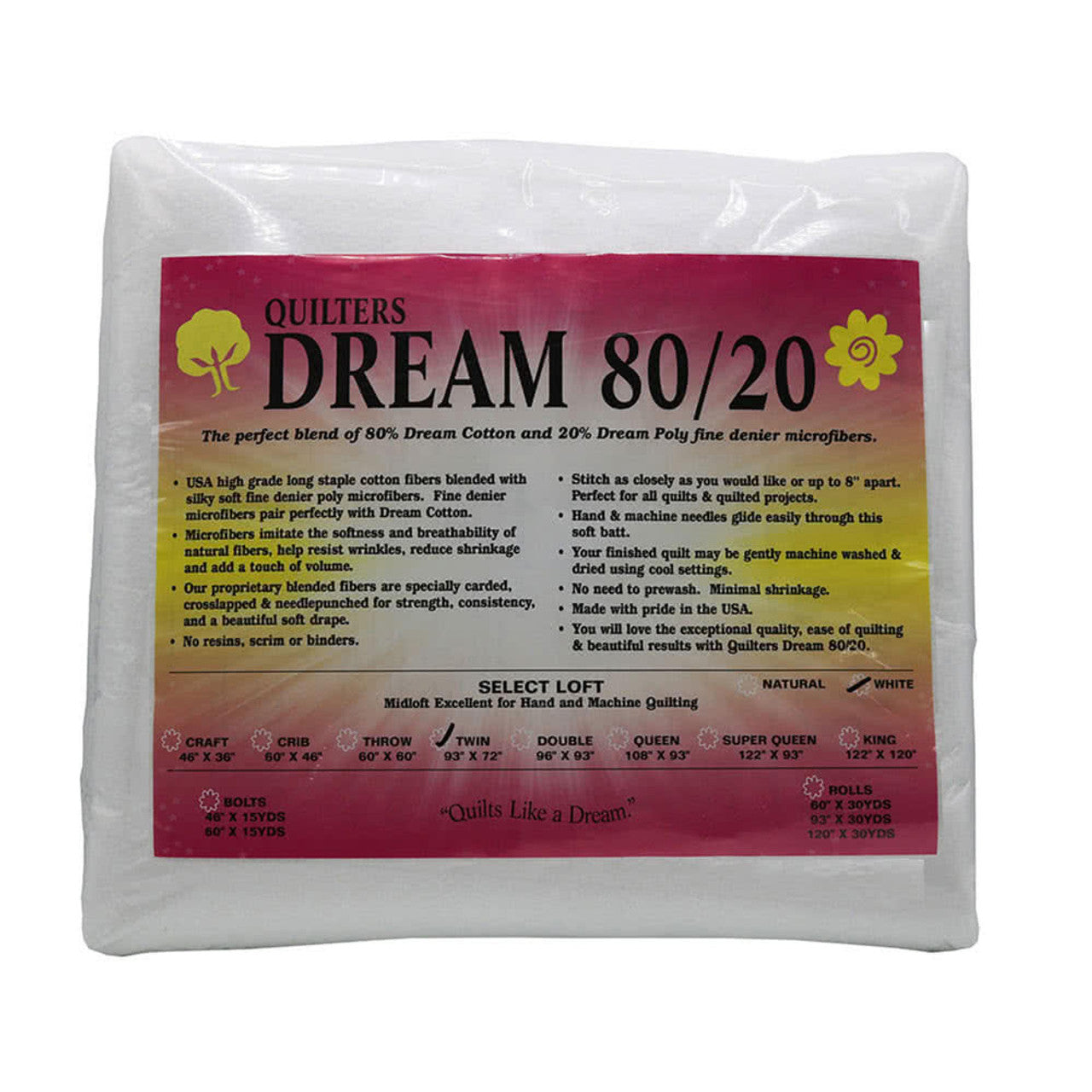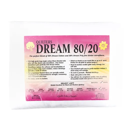 Quilters Dream 80/20 the perfect blend of 80% high grade long staple USA cotton fiber paired with 20% fine denier poly microfiber for a soft, silky batting that drapes beautifully and breathes well. The long staple cotton fiber reduces shrinkage and adds stability so that the stitches can be up to 8” apart. The poly micro fibers add loft and resistance to creases/wrinkles. Our proprietary blended fibers are specially carded, cross-lapped, and needle-punched for strength, consistency, and a beautiful soft drape. There are no scrims, glues, or other binders to resist the needle, so this fine batting can be hand or machine quilted with ease.
