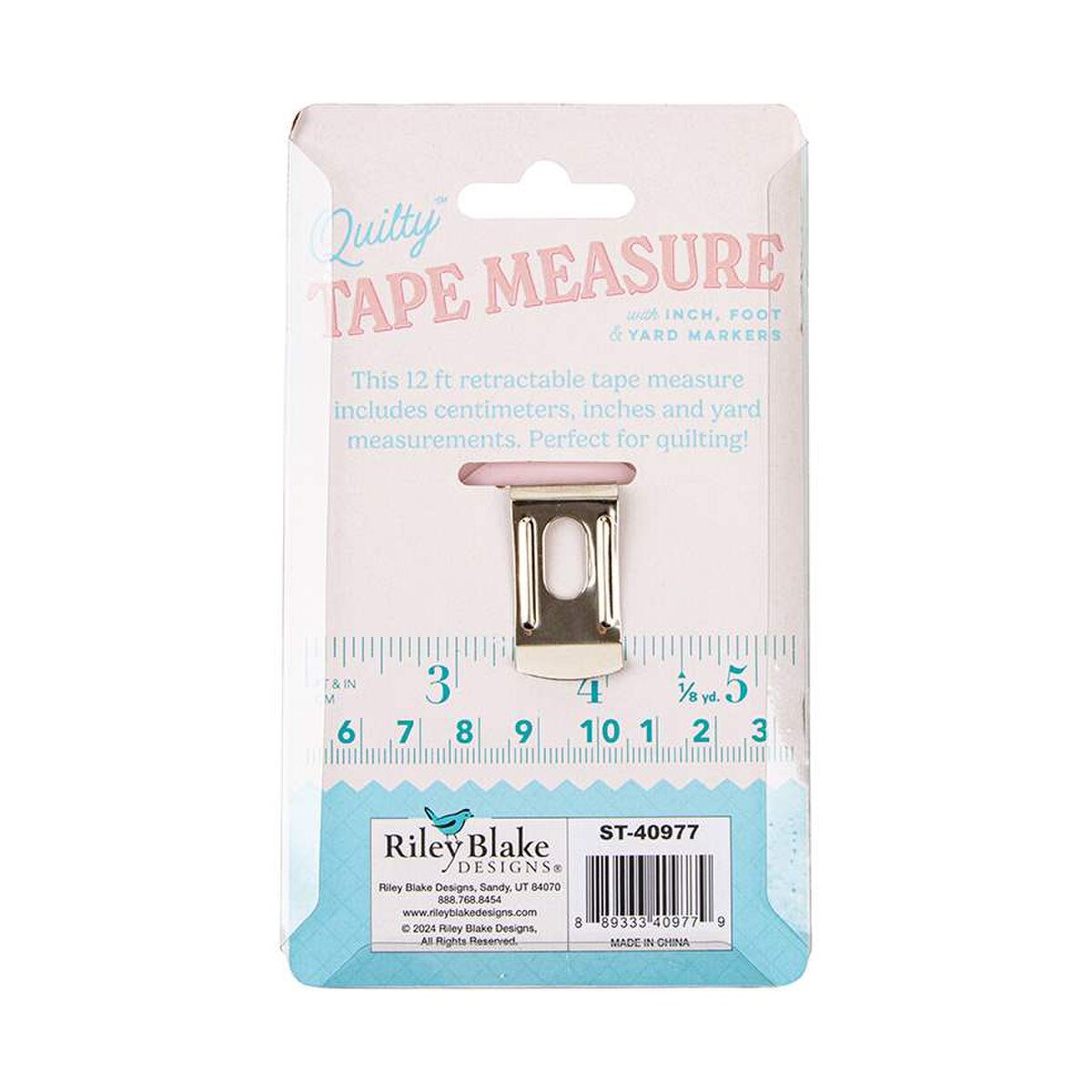 The Riley Blake Designs Quilty™ Measure will measure your quilt backs and batting with ease. It is a 12-foot retractable tape with both inches and centimeters and includes quilting measurements. Size is approximately 2 1/4" x 2 1/4".