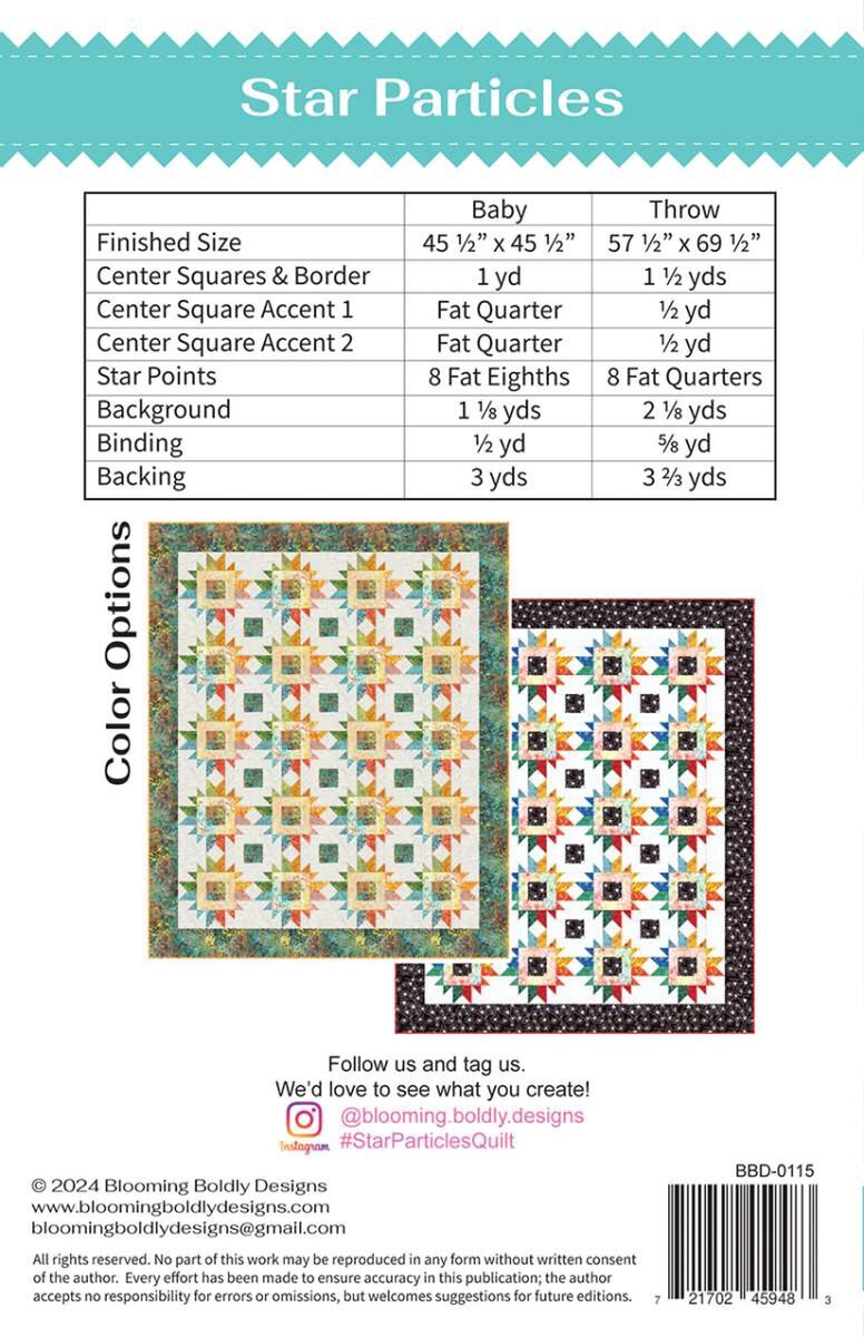 The Star Particles Quilt by Leslie Ryan of Blooming Boldly Designs features bordered squares with ribbon like star points and uses traditional piecing methods. Pattern includes instructions for Baby (45 1/2" x 45 1/2") and Throw (57 1/2" x 69 1/2") sizes.