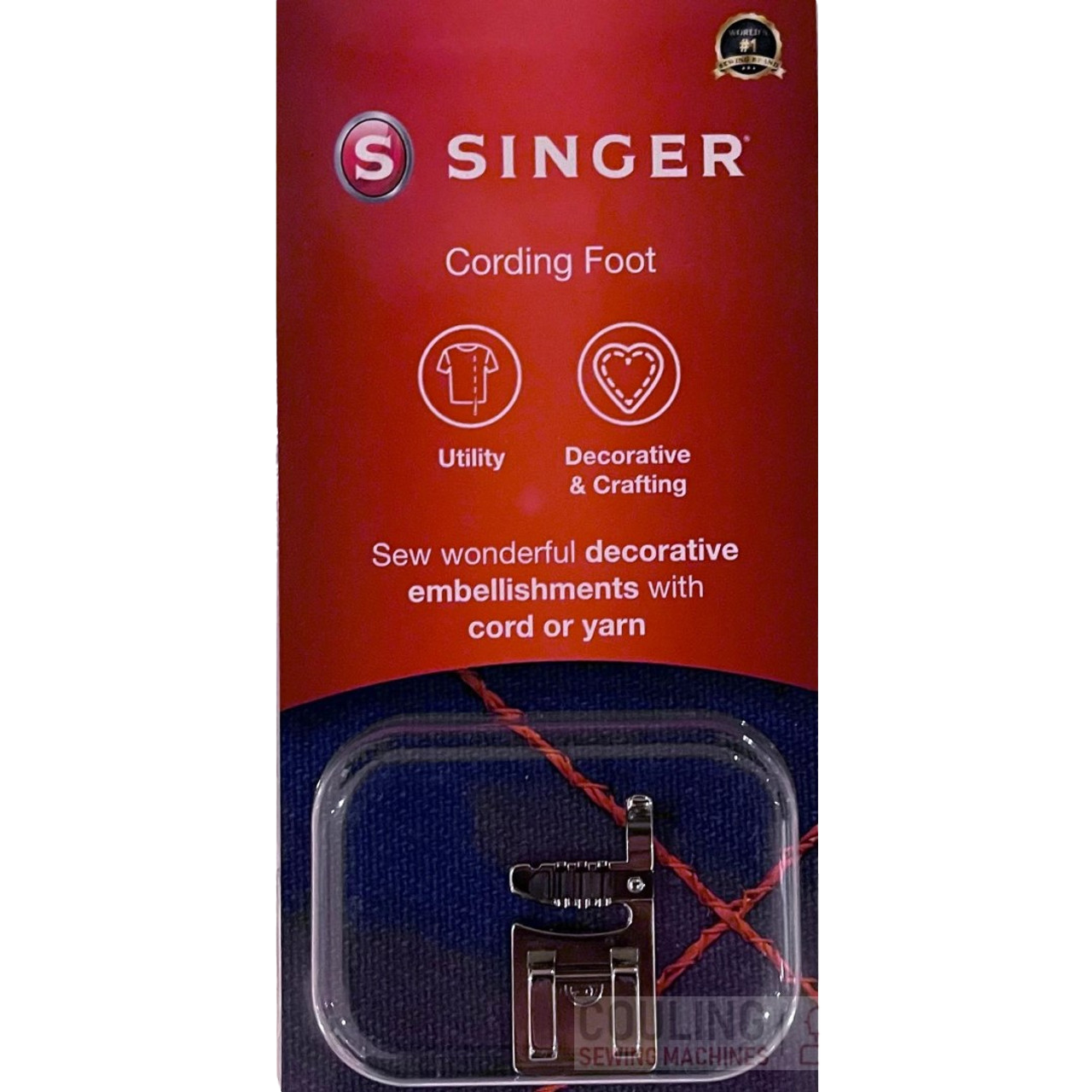 Stitch decorative embellishments with cord or yarn using this clever Cording Foot from Singer. Handy video instructions which are instantly available using your smart phone camera to scan the QR code on the packaging. Add surface embellishment to fabrics with cords, thin braids, embroidery floss or yarn.