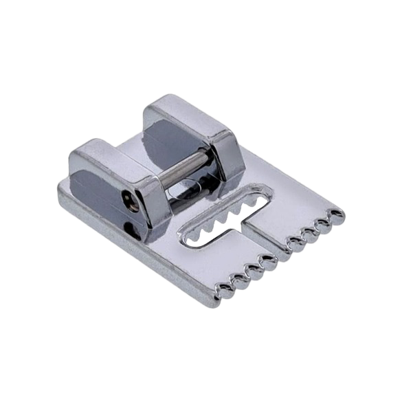 The Pintuck Foot is used for embellishing garments, table linens and bed linens, typically in conjunction with a twin needle (not included). Working with a twin needle, the foot creates evenly-spaced raised tucks in the fabric. It has a series of evenly-spaced grooves on the underside which allows for perfectly parallel rows of raised tucks that will not be flattened when sewn. Increase the upper thread tension or add a cord for more pronounced tucks. Sew intersecting rows of tucks for interesting texture on the fabric! Works best with lightweight fabrics such as batiste, silk, and organdy.