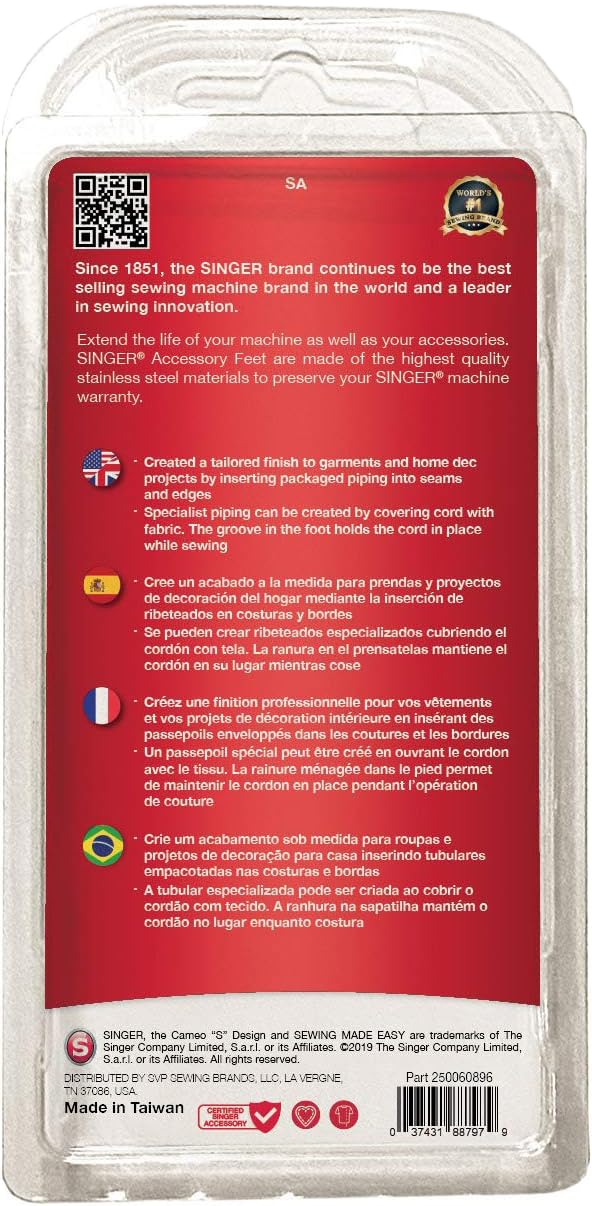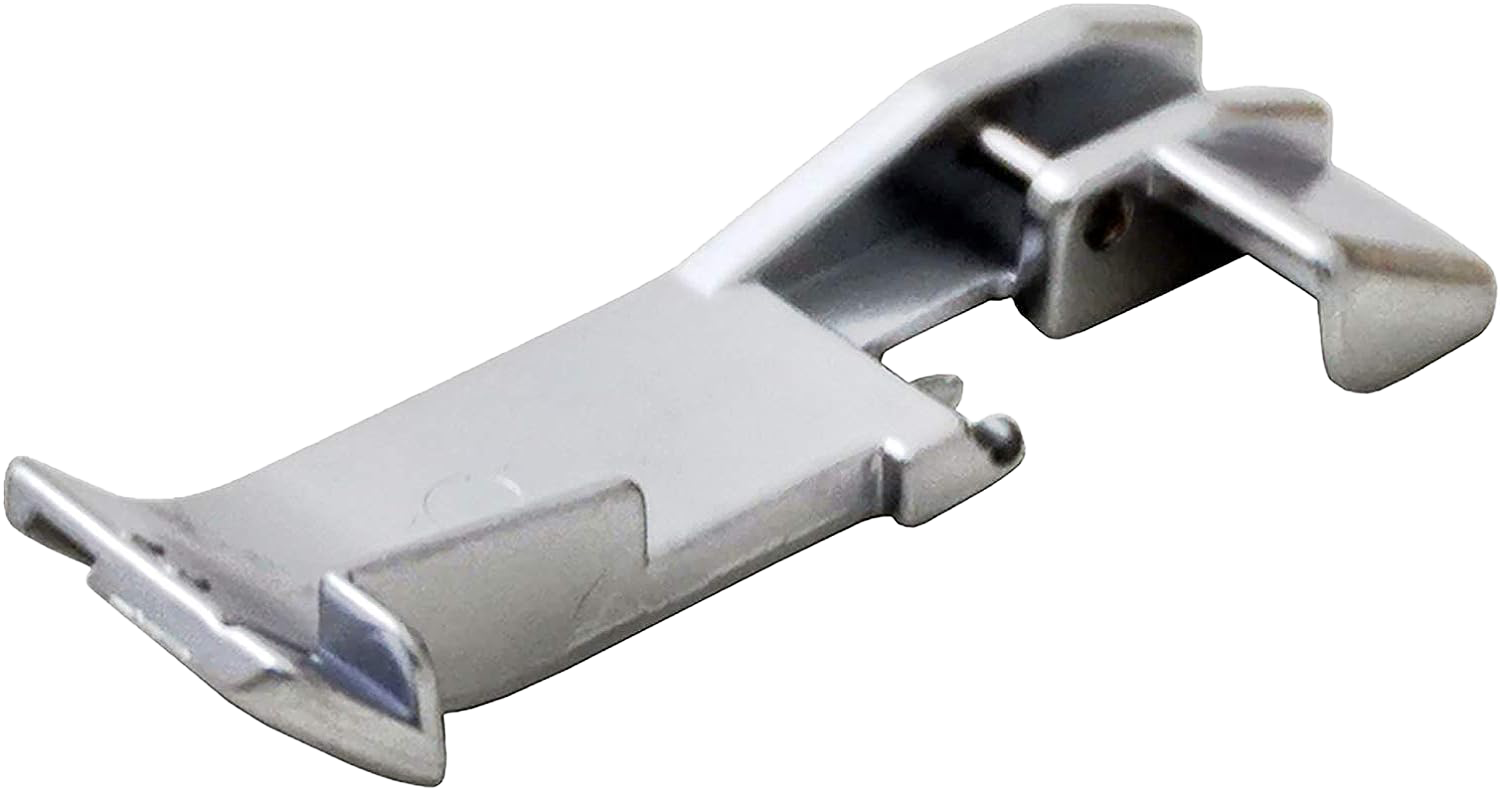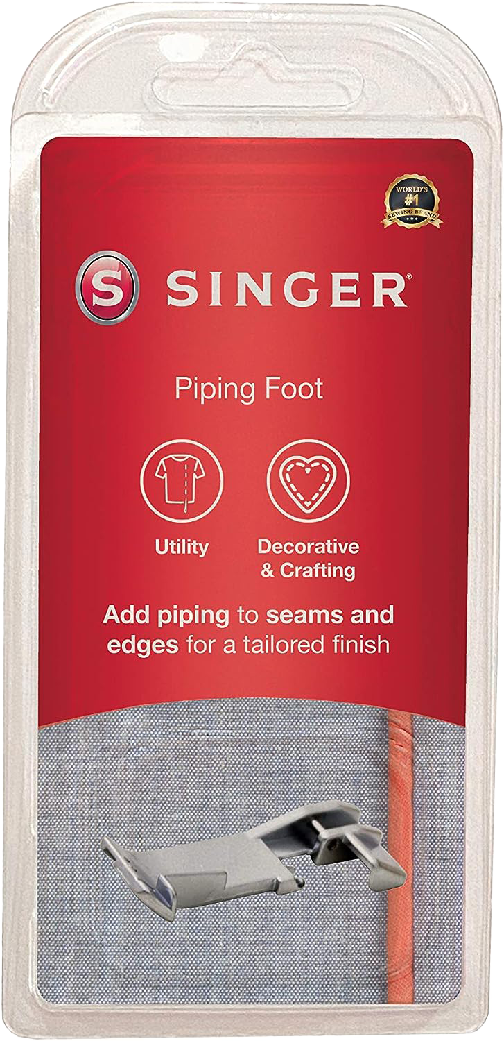 The Piping Foot is used to insert packaged piping into seams and edges for a tailored finish. For specialty piping, cord can be covered with fabric. The clear view allows you to see your stitching and piping placement and to see the first row of stitching and adjust your needle position appropriately to stitch next to the original row.