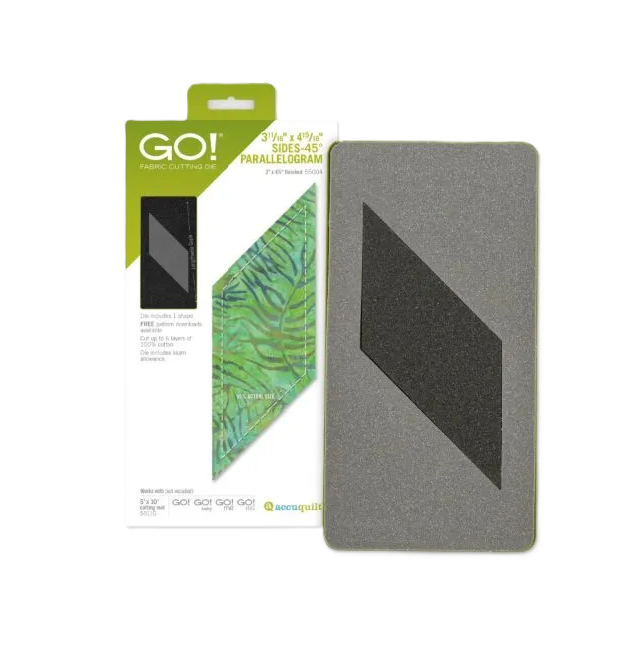 • Parallelograms are a basic building block in quilting. A simple shape that adds a great twist to quilt designs. The GO! Parallelogram-3 11/16" x 4 15/16" die is typically used with GO! Half Square Triangle-3" Finished Square (55009, 55775, 55778).