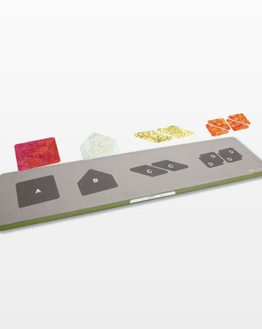 • Cut Size: Square (A): 3-1/4" x 3-1/4" (8.3 cm x 8.3 cm), Pentagon (B): 3-1/4" x 3-1/4" (8.3 cm x 8.3 cm), (2) Diamonds (C): 3-1/4" x 1-7/8" (7.3 cm x 4.8 cm) and (4) Half Square Triangles (D): 1-7/8" x 1-7/8" (4.8 cm x 4.8 cm).