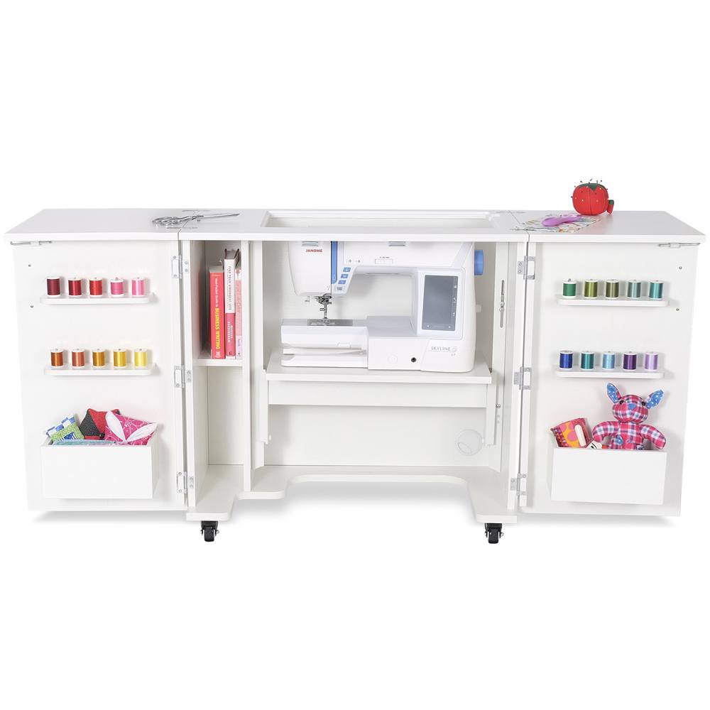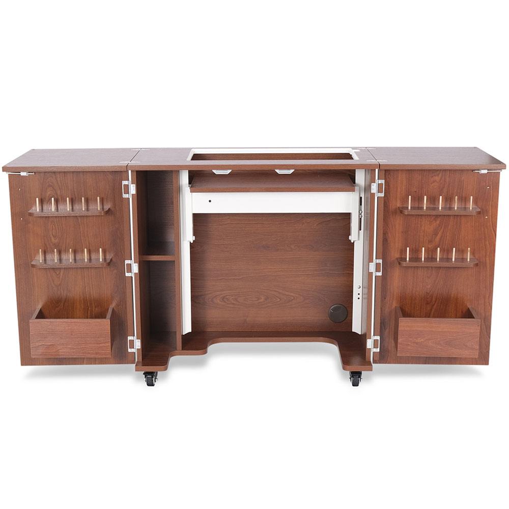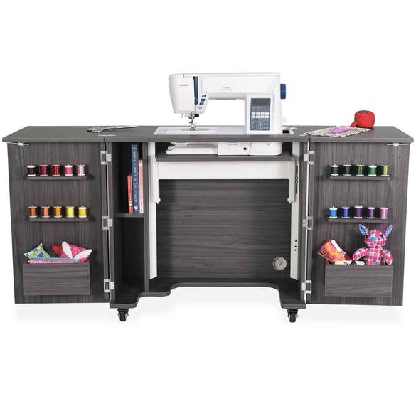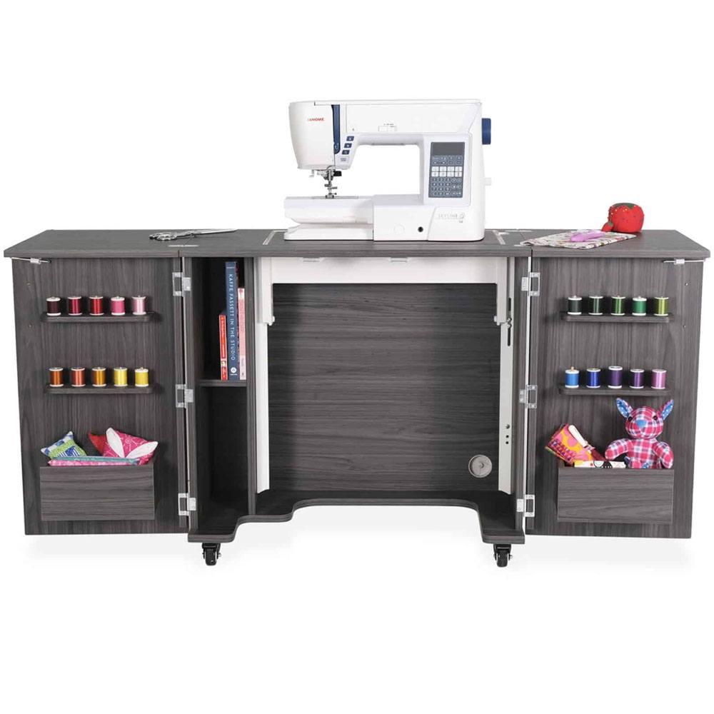 Bandicoot Sewing Cabinet is the signature mid-size sewing cabinet by Kangaroo Sewing Furniture highlighted by a 3-position hydraulic sewing lift for free arm and flat bed sewing, and its home-friendly collapsible footprint! Bandicoot features a dual shelving unit, 10 thread spool holders per door, and spacious door cubbies to store sewing notions, scissors and fabric swatches! A timeless design with signature features – let Bandicoot Sewing Cabinet recapture your sewing and crafting passion!