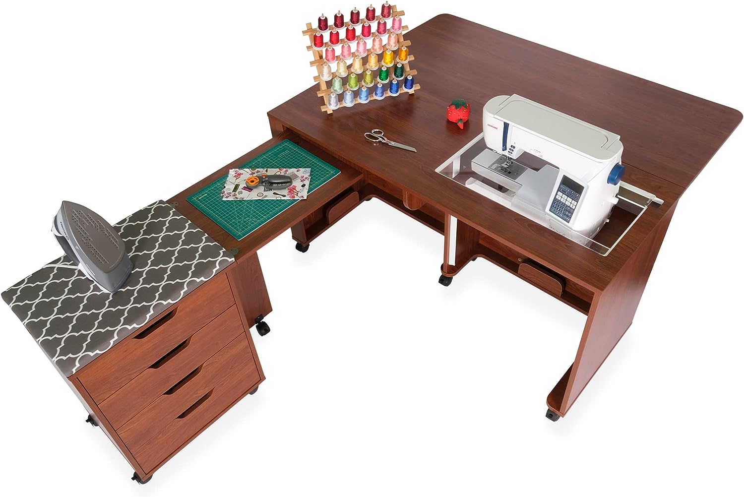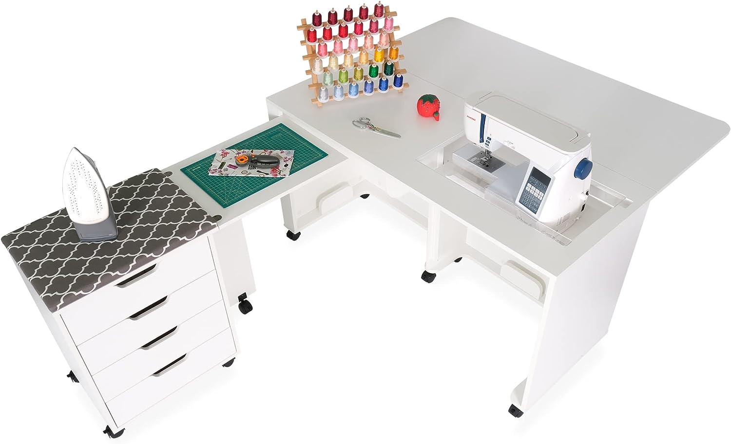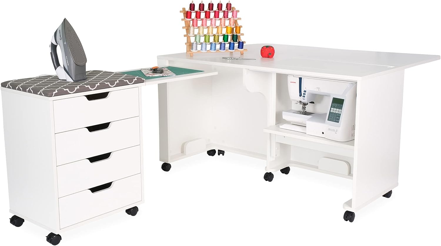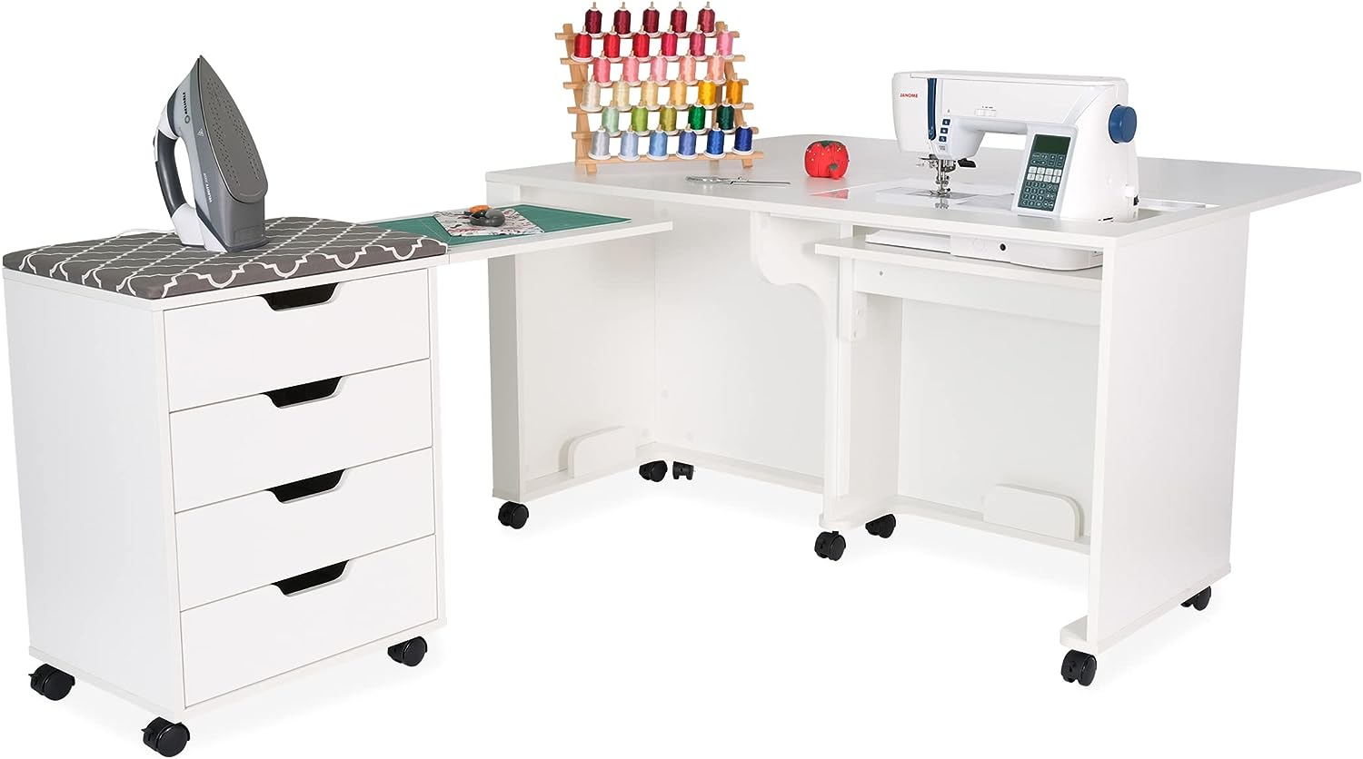 • Expandable caddy provides ironing, cutting workspace and storage for notions