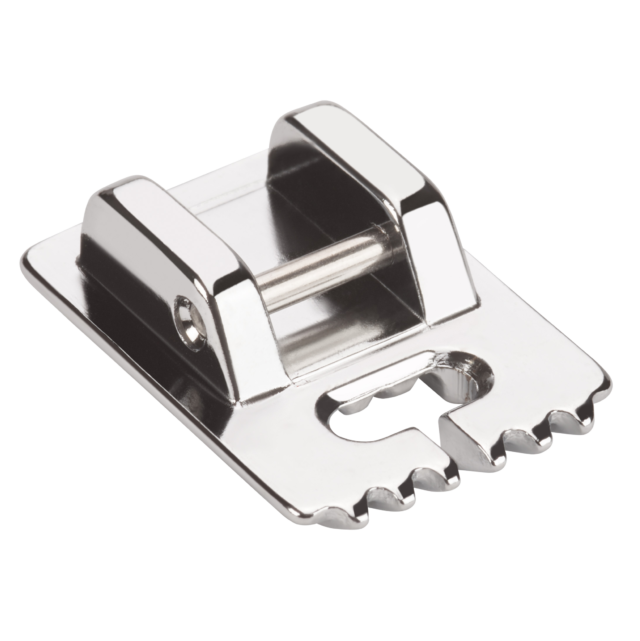 Pintuck foot with grooves is used when sewing pintucks with a double needle. The grooves enable you to sew parallel tucks.