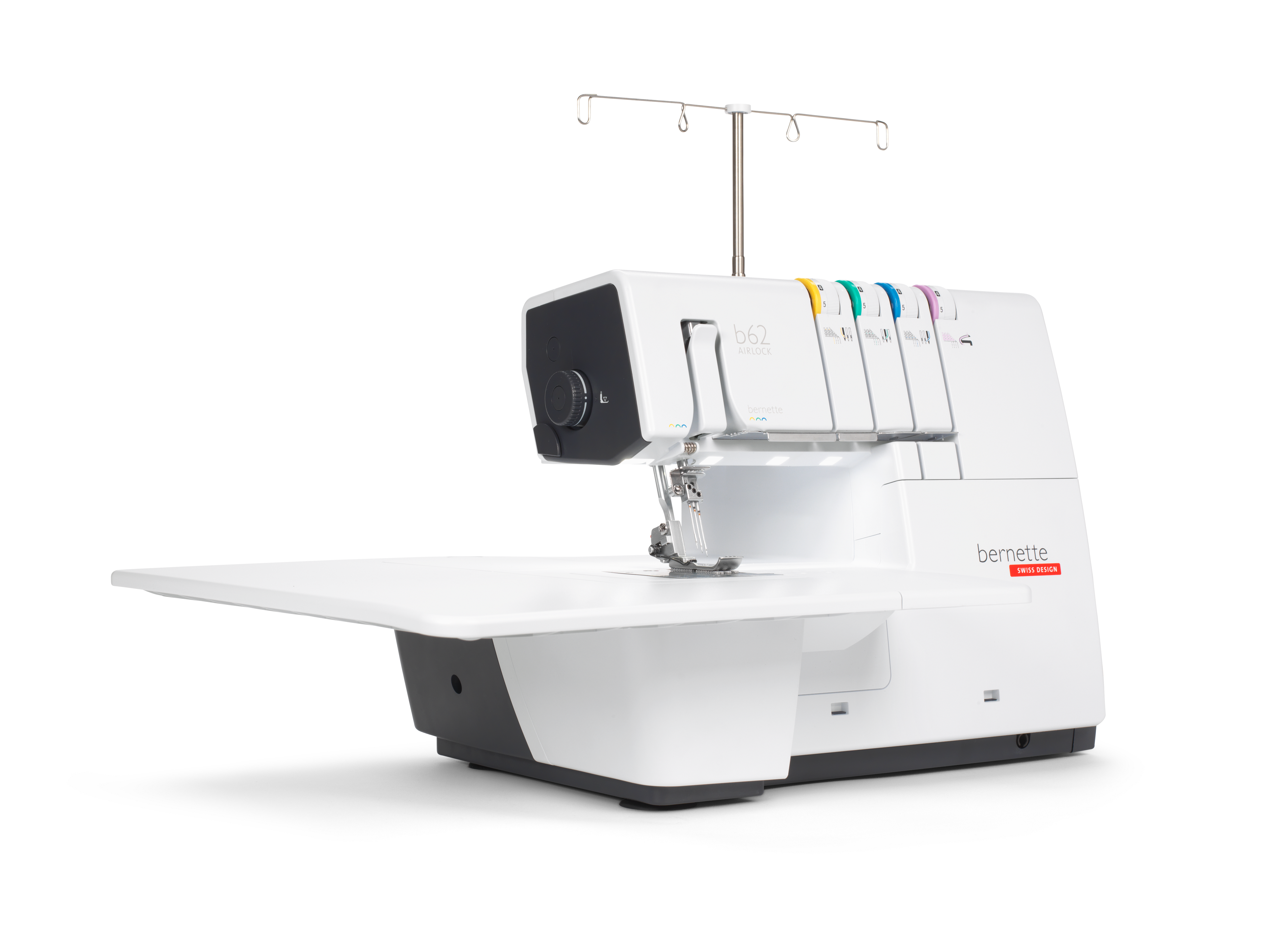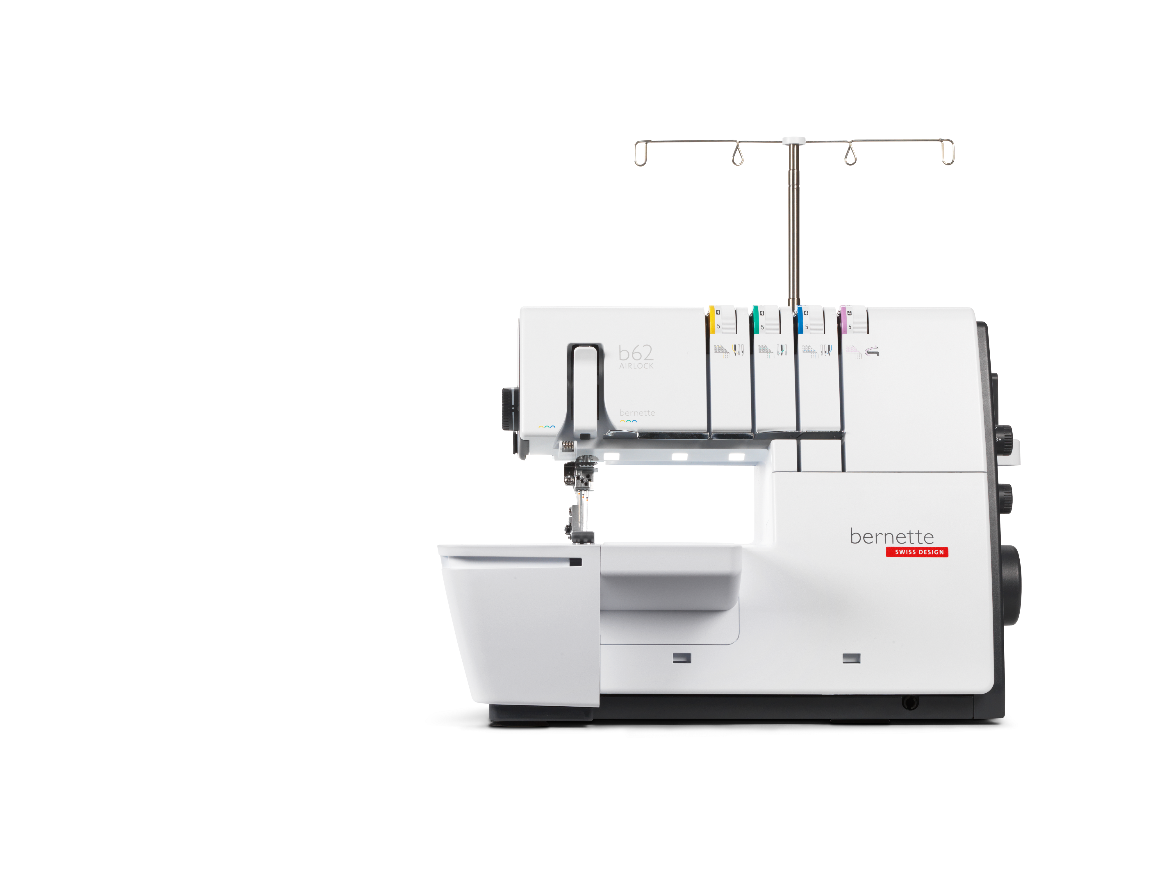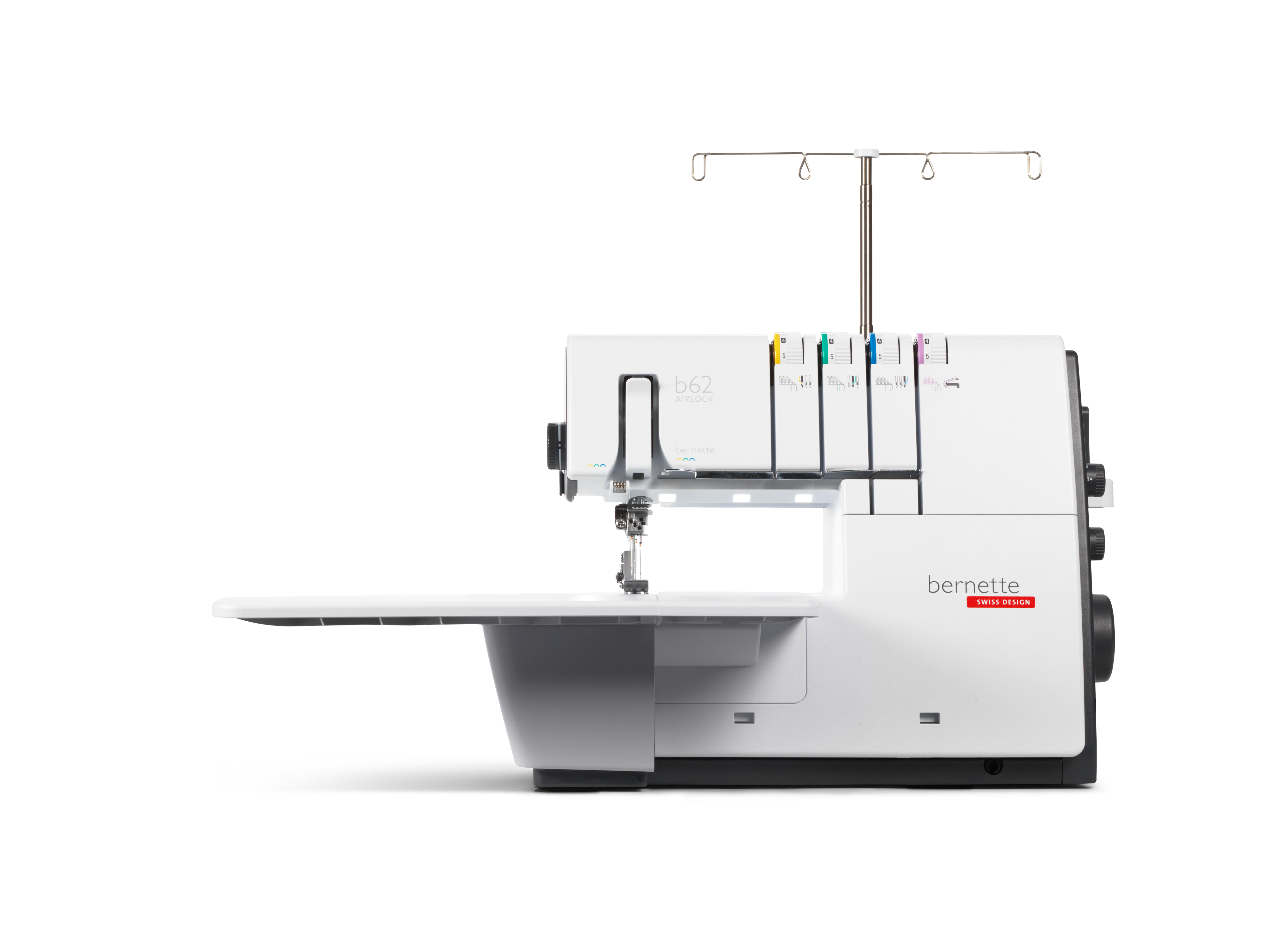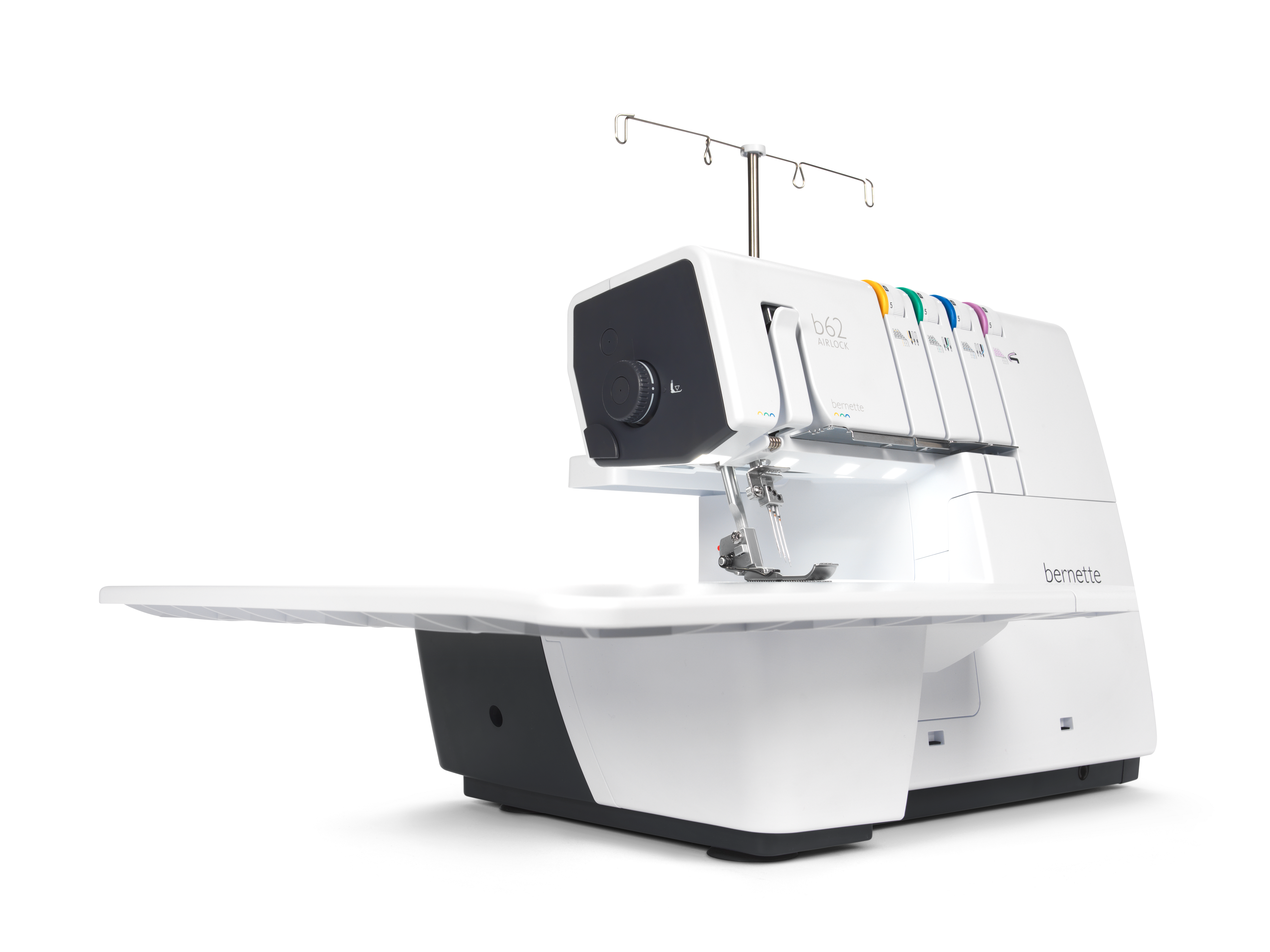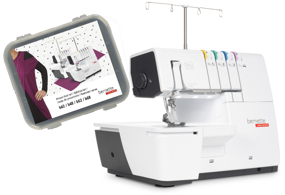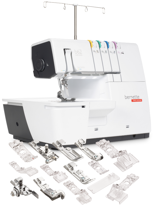 The coverstitch machine with easy air threading. The bernette 62 AIRLOCK is the coverstitch machine of the b60 series. The automatic air threader makes threading the looper thread child's play. The machine has 4 coverstitches and 3 chainstitches and can be used for countless applications, with which different fabric types – stretchy fabrics in particular – can be sewn perfectly. The presser foot can be lowered and temporarily raised with the knee lifter, leaving both hands free to guide the fabric. The slide-on table and matching coverstitch insert increase the sewing area and provide sufficient space for large projects. Thanks to the 5 LEDs, the large working area is brightly illuminated.