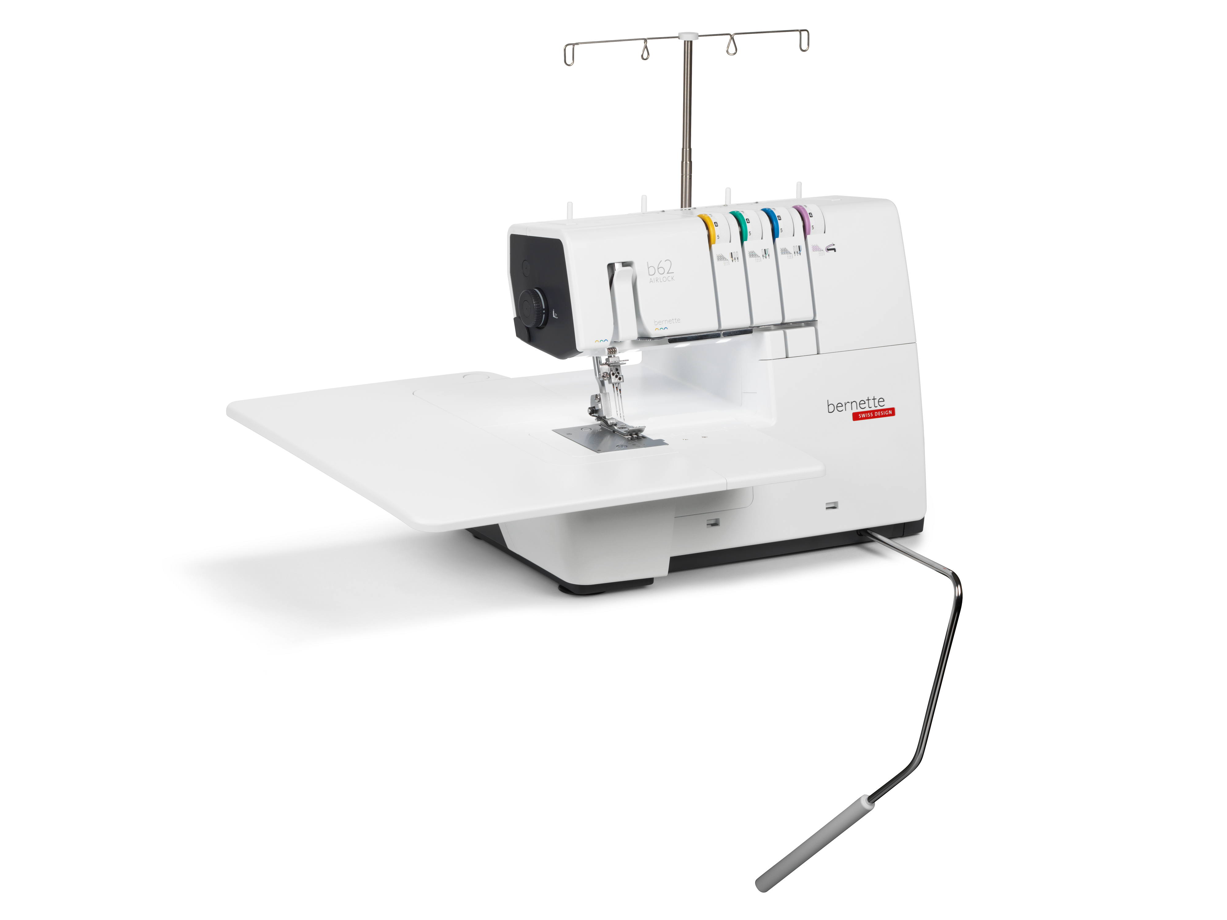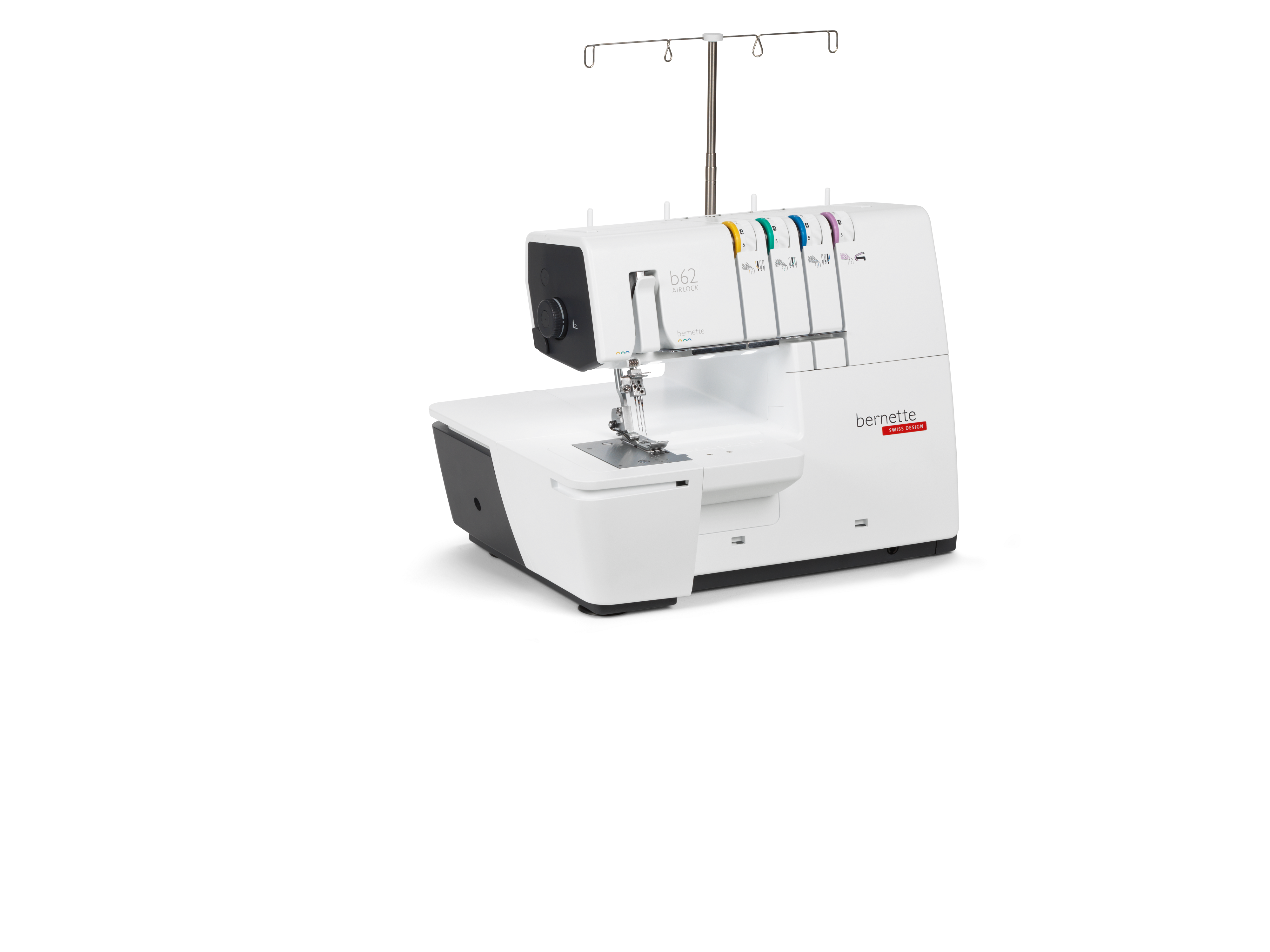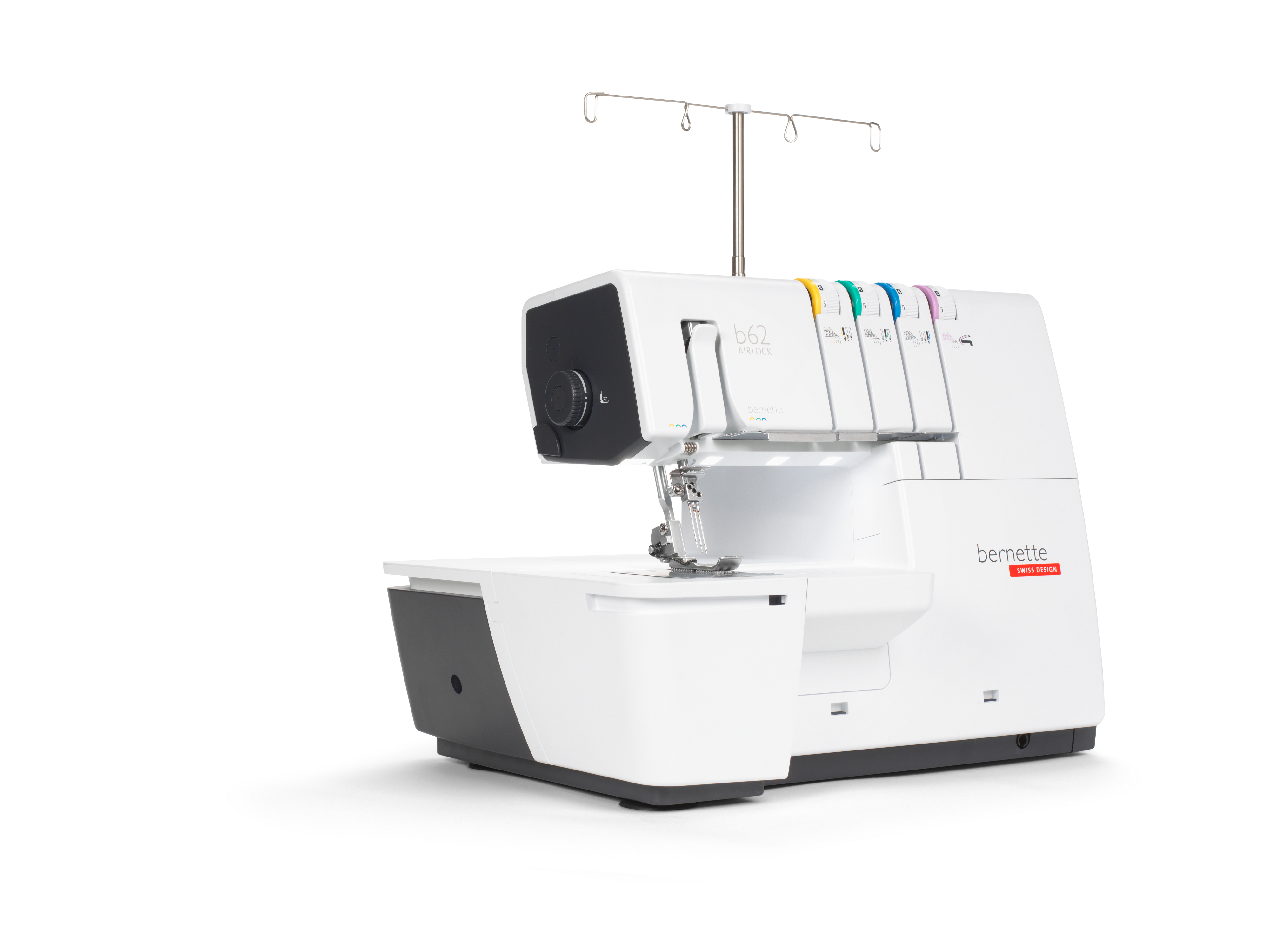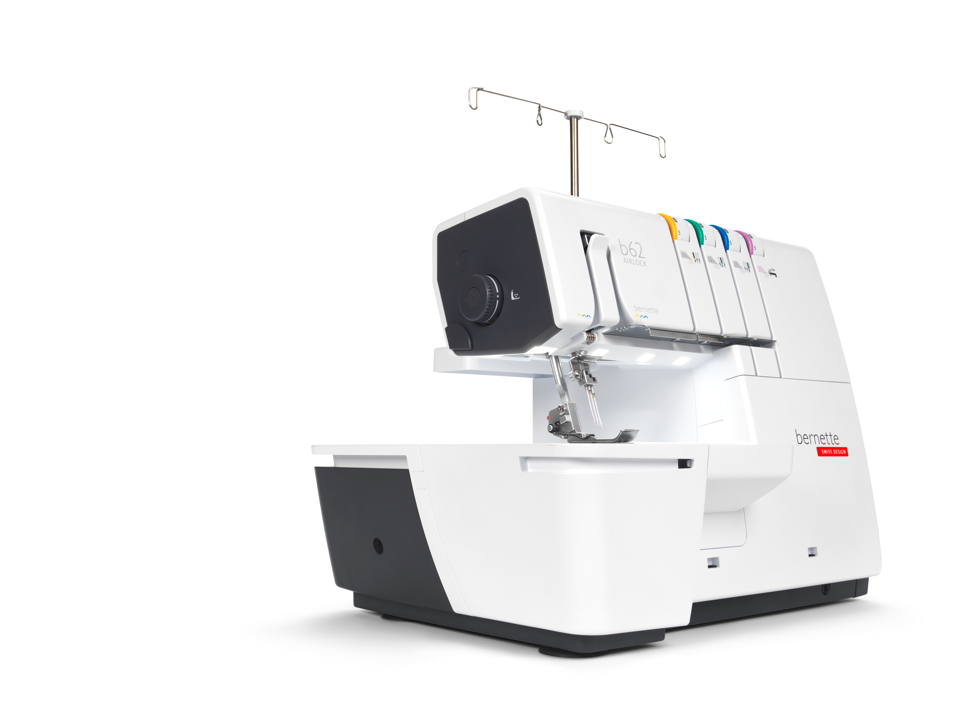 The coverstitch machine with easy air threading. The bernette 62 AIRLOCK is the coverstitch machine of the b60 series. The automatic air threader makes threading the looper thread child's play. The machine has 4 coverstitches and 3 chainstitches and can be used for countless applications, with which different fabric types – stretchy fabrics in particular – can be sewn perfectly. The presser foot can be lowered and temporarily raised with the knee lifter, leaving both hands free to guide the fabric. The slide-on table and matching coverstitch insert increase the sewing area and provide sufficient space for large projects. Thanks to the 5 LEDs, the large working area is brightly illuminated.