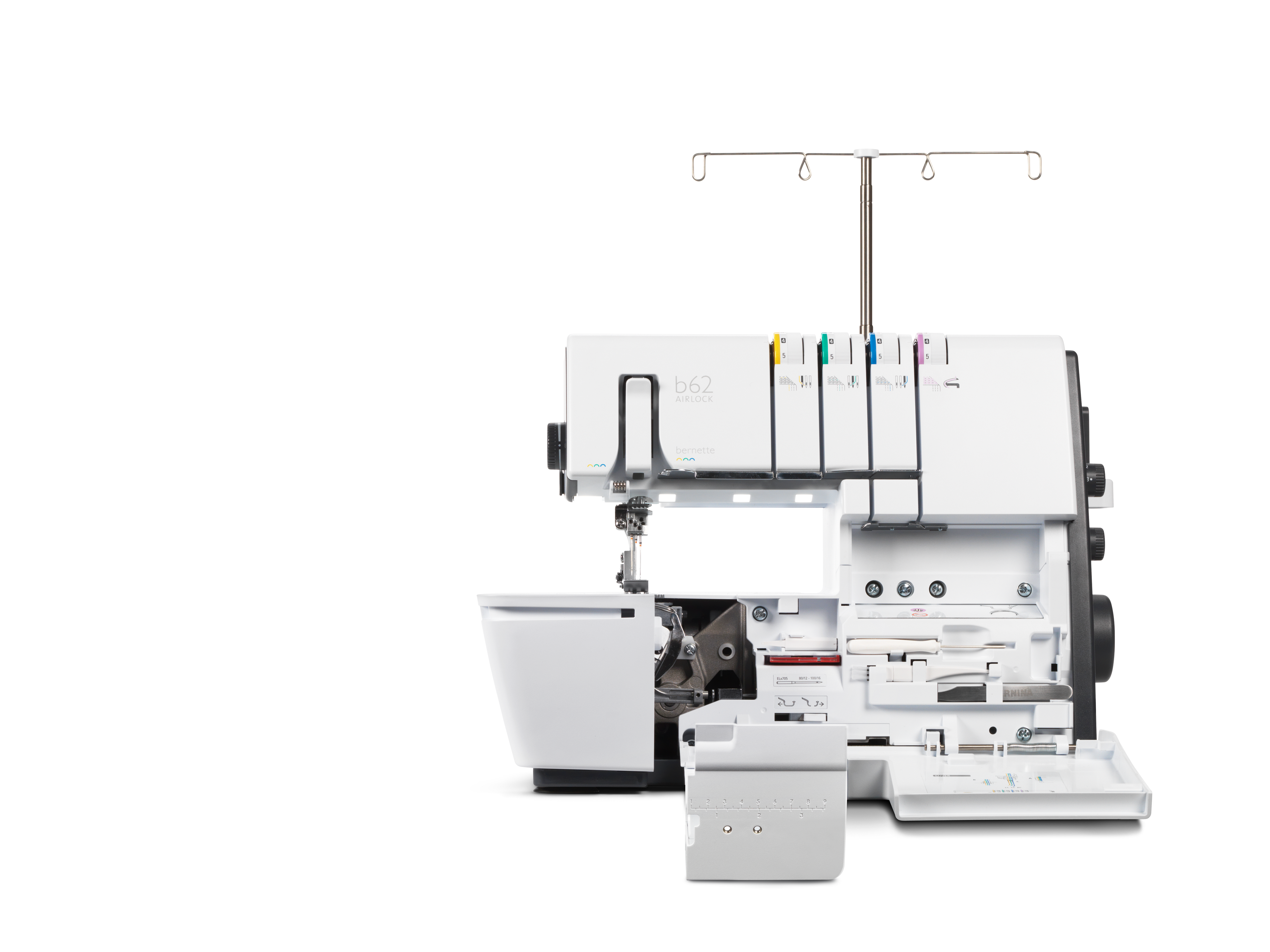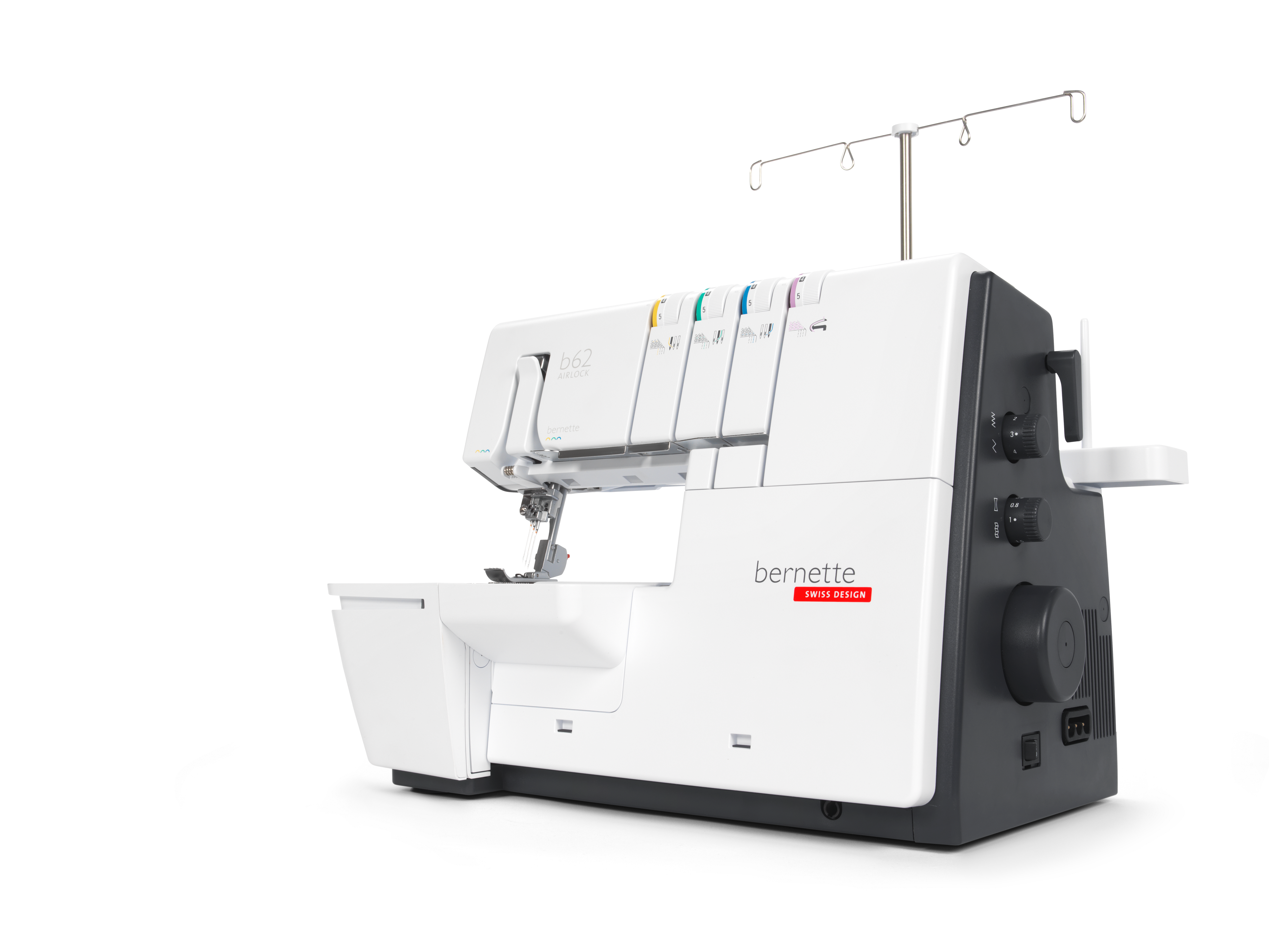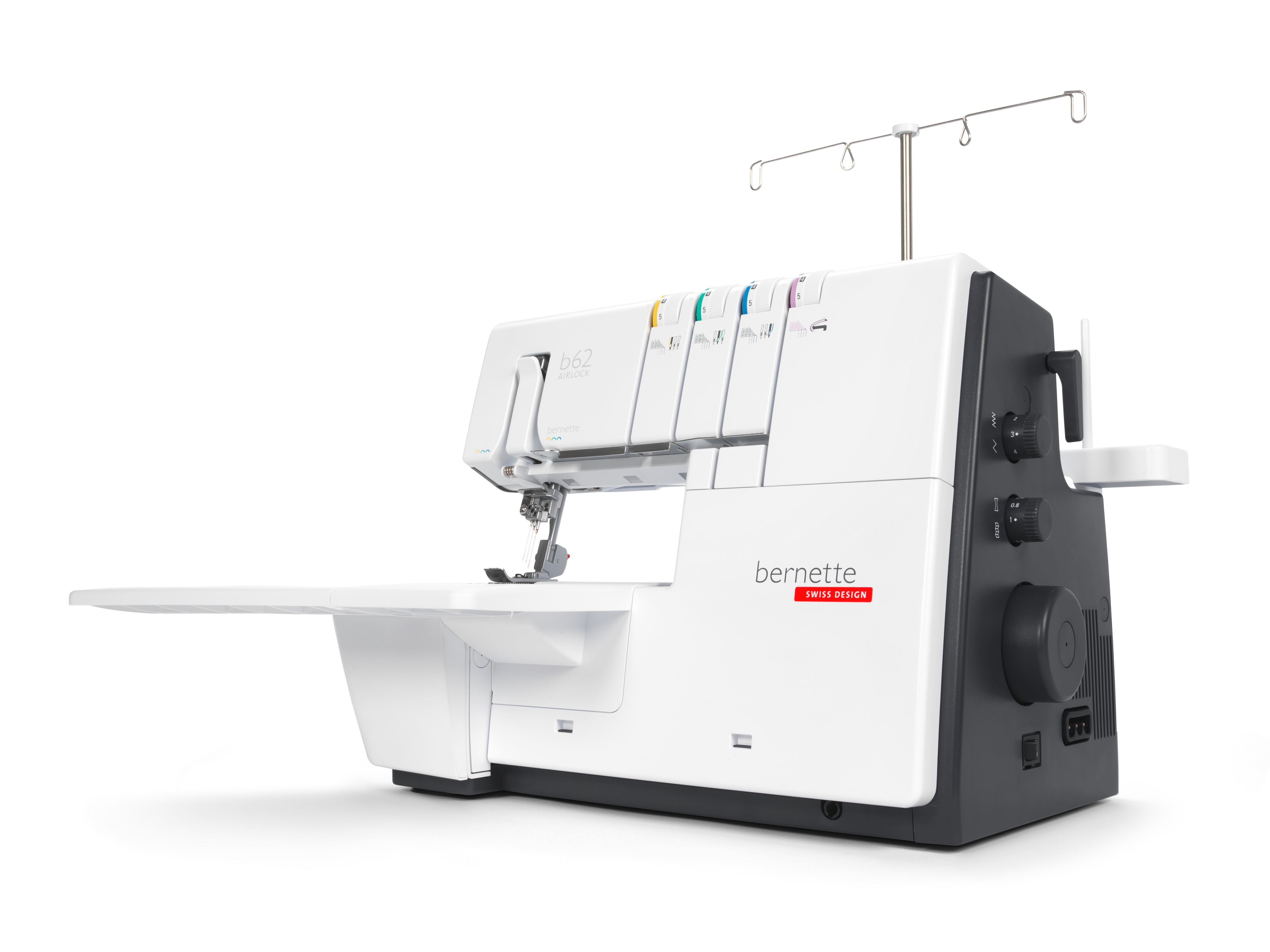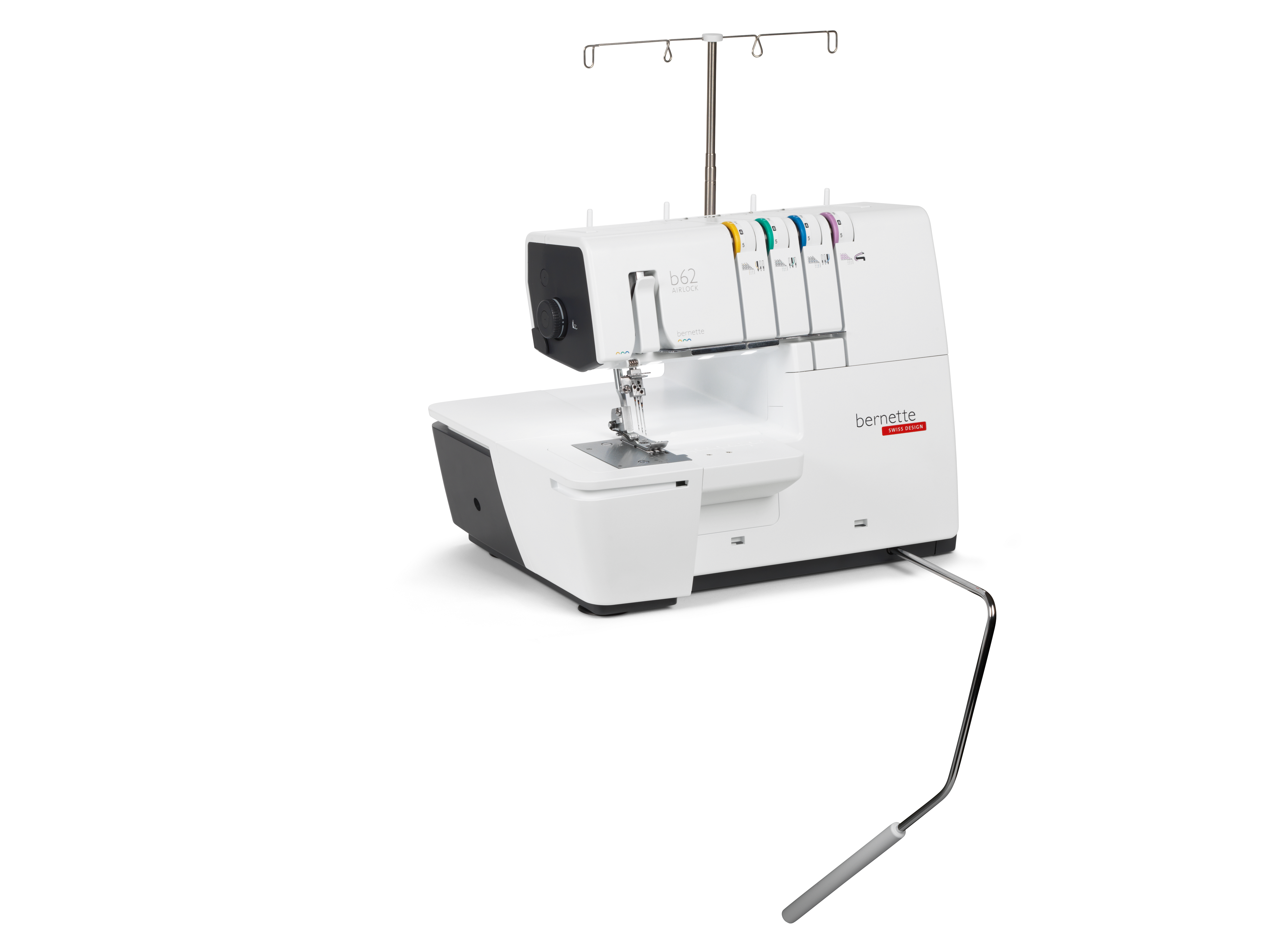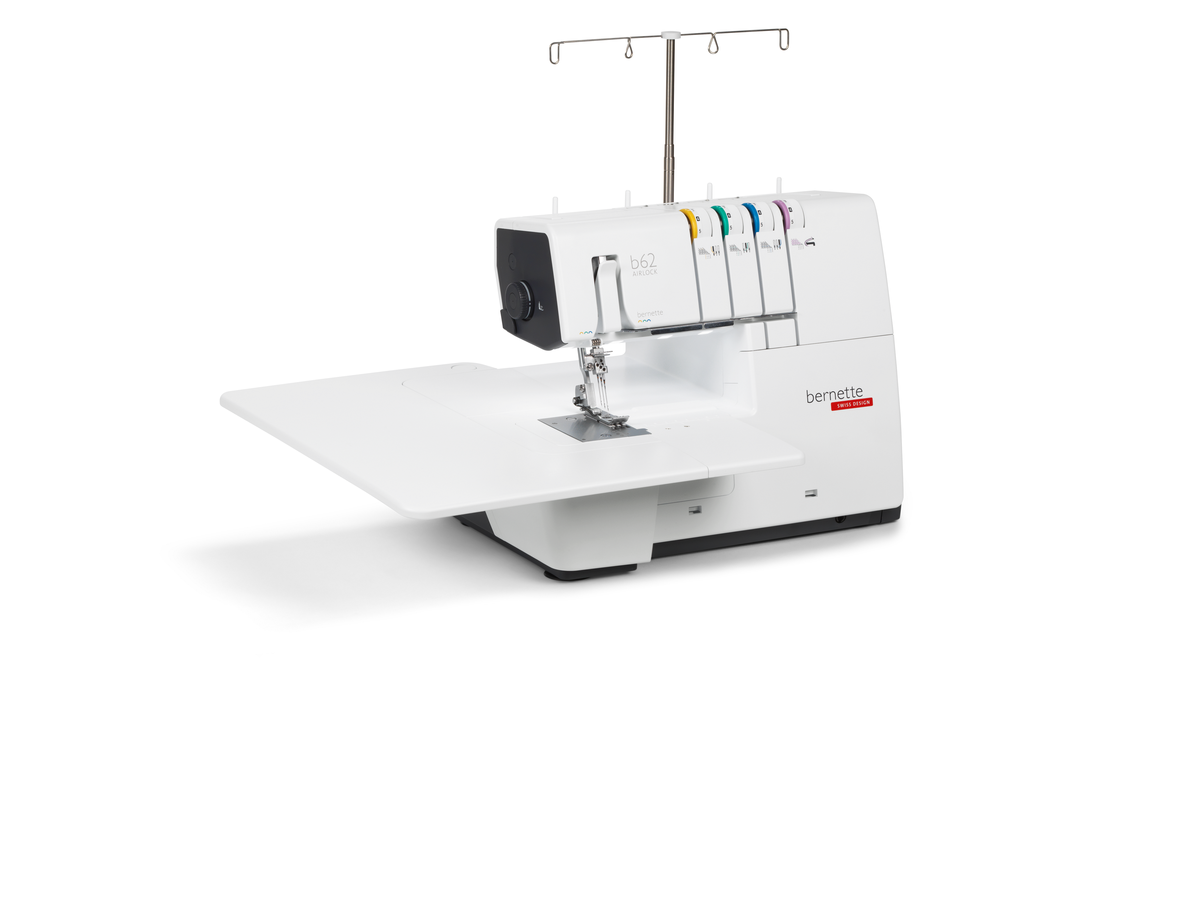 The coverstitch machine with easy air threading. The bernette 62 AIRLOCK is the coverstitch machine of the b60 series. The automatic air threader makes threading the looper thread child's play. The machine has 4 coverstitches and 3 chainstitches and can be used for countless applications, with which different fabric types – stretchy fabrics in particular – can be sewn perfectly. The presser foot can be lowered and temporarily raised with the knee lifter, leaving both hands free to guide the fabric. The slide-on table and matching coverstitch insert increase the sewing area and provide sufficient space for large projects. Thanks to the 5 LEDs, the large working area is brightly illuminated.