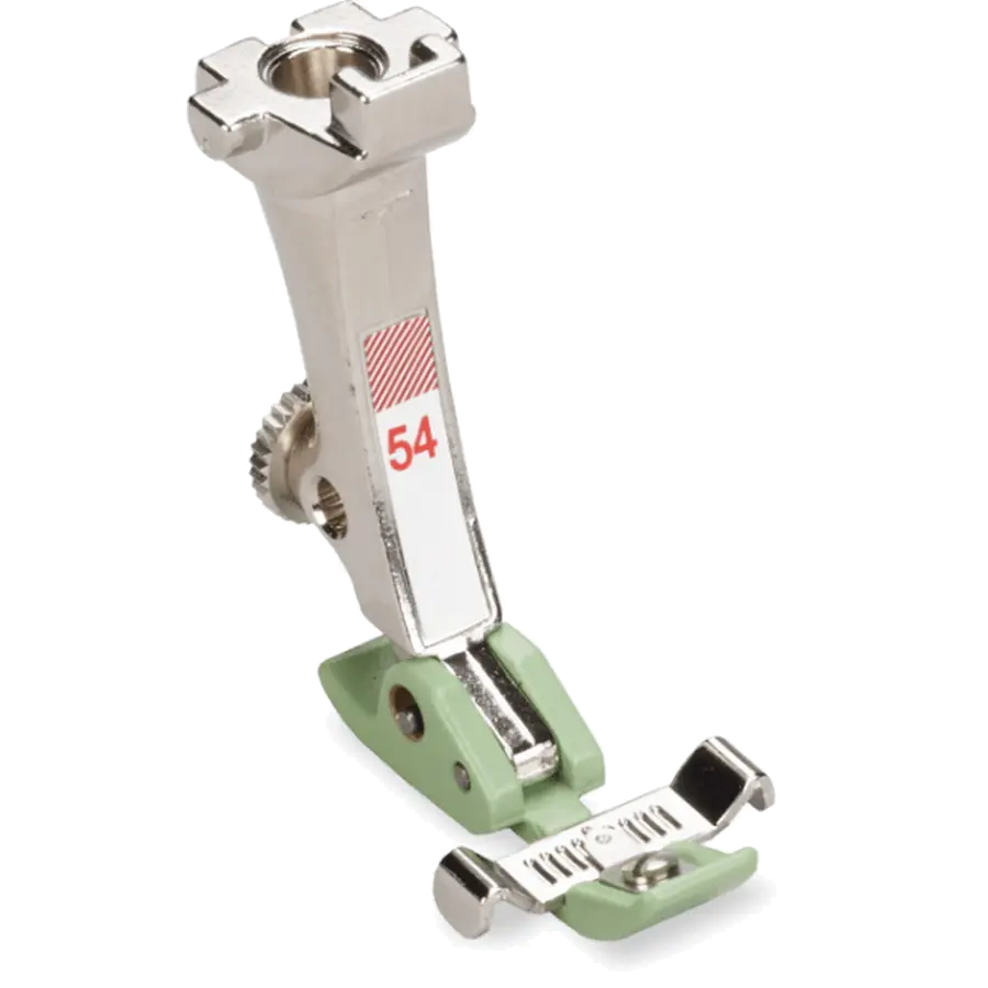 Zipper foot #54 with non-stick sole is especially suited to attaching zippers to “sticky” fabrics such as leather or plastic. Just like Zipper foot #14 /14D, Zipper Foot with Non-Stick Sole #54 features an Adjustable Guide on the top of the foot. This lets you sew perfectly even, parallel straight-stitched seams when edgestitching or attaching piping.
